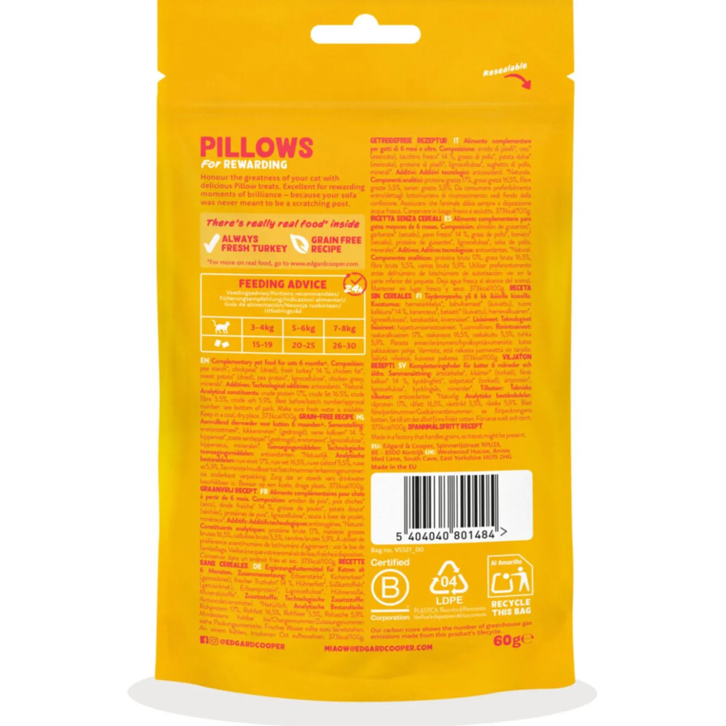 | Aanbeveling | Met onze overheerlijke Pillow snacks beloon je alles wat zalig is aan katten. Omdat ze je zetel niet als krabpaal gebruiken, omdat ze spontaan in hun reismand springen of gewoon omdat ze zo schattig zijn. Pillows zijn de verdiende beloning voor poeslief gedrag.Een zachte, rrromige vulling in een krokant jasje. Wedden dat je kat deze verrassende textuur onweerstaanbaar vindt? Boordevol lekker verse kalkoen en natuurlijke ingrediënten – zonder granen of toegevoegde suiker. En met minder dan 2 kcal per snack mag je je kat gerust nog een keer belonen, en nog eens en nog eens.Het resultaat? Een gelukkige kat die zich helemaal thuisvoelt en super close is met jou.Ideaal voor katten vanaf 6 maanden. |
