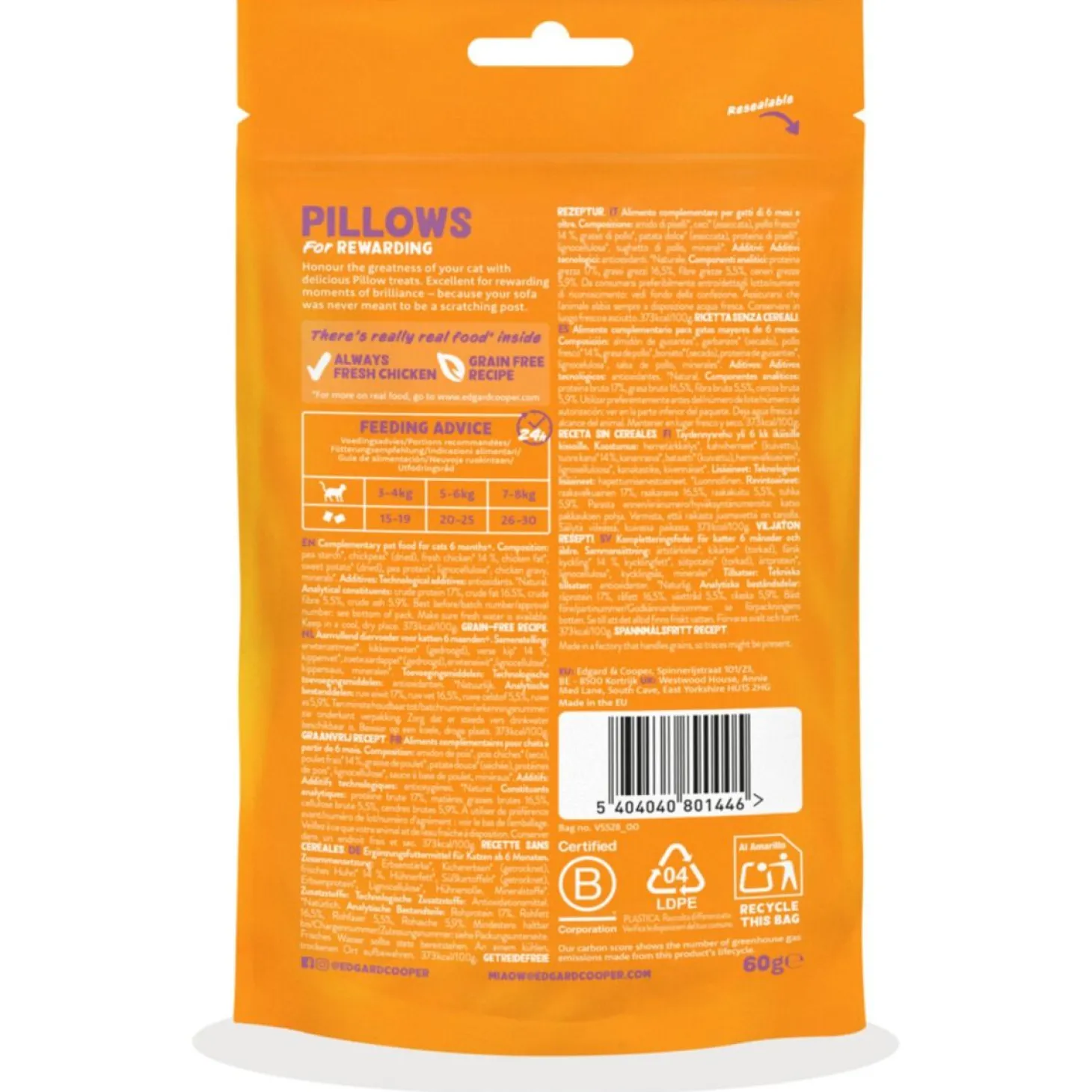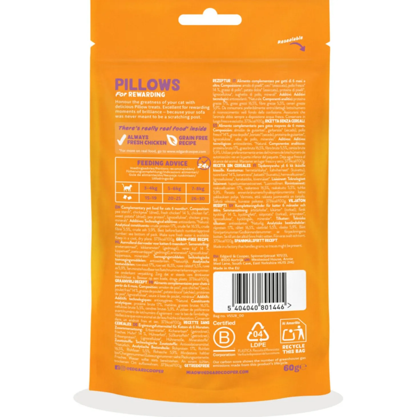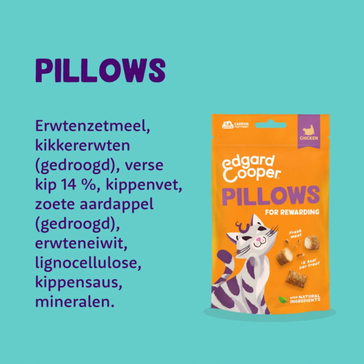 | Aanbeveling | Füttere sie als leckeren Snack oder Belohnung – Freudensprünge und Wohlfühl-Schnurren garantiert. Folge unseren Fütterungsrichtlinien auf der Packung, damit deine Katze auch die richtige Menge bekommt. Stelle sicher, dass ihr immer frisches Wasser zur Verfügung steht.||Feed as a tasty treat or reward and watch your feline friend pounce and purr in pure satisfaction. Follow our feeding guidelines on the packaging to ensure you’re giving the right amount for your cat. Always make sure fresh drinking water is available.||Comblez tous les désirs de votre chat avec nos friandises dédiées. Assurez-vous de ne pas dépasser la quantité journalière recommandée sur l’emballage. Veillez à ce que votre chat ait toujours de l’eau fraîche à disposition.||Geef Pillows als lekkere snack of als beloning voor poeslief gedrag, en zie hoe gelukkig je kat is. Volg onze voedingsrichtlijnen op de verpakking. Zo ben je gerust dat je de juiste hoeveelheid geeft voor je kat. Zorg altijd voor vers drinkwater. |
