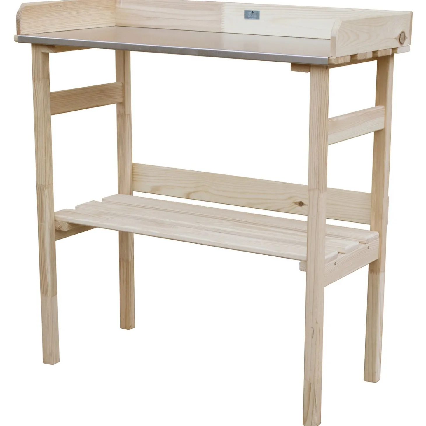 De tafel heeft een (verwijderbare) zinken werkblad, dit geeft een egale ondergrond om op te werken en is natuurlijk makkelijk te reinigen. De rand om de tafel heen zorgt voor een goede beschutting van de stekjes. Onder de tafel zit een extra schap waar je gereedschap en de potjes kunt opbergen.