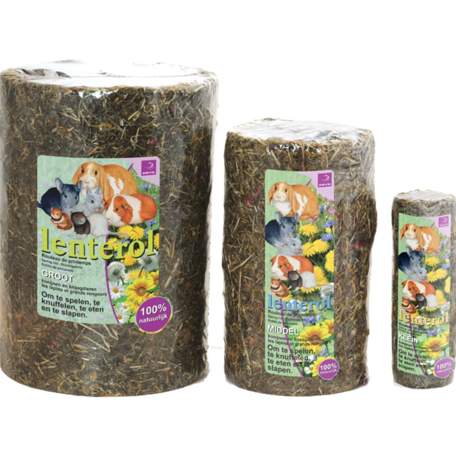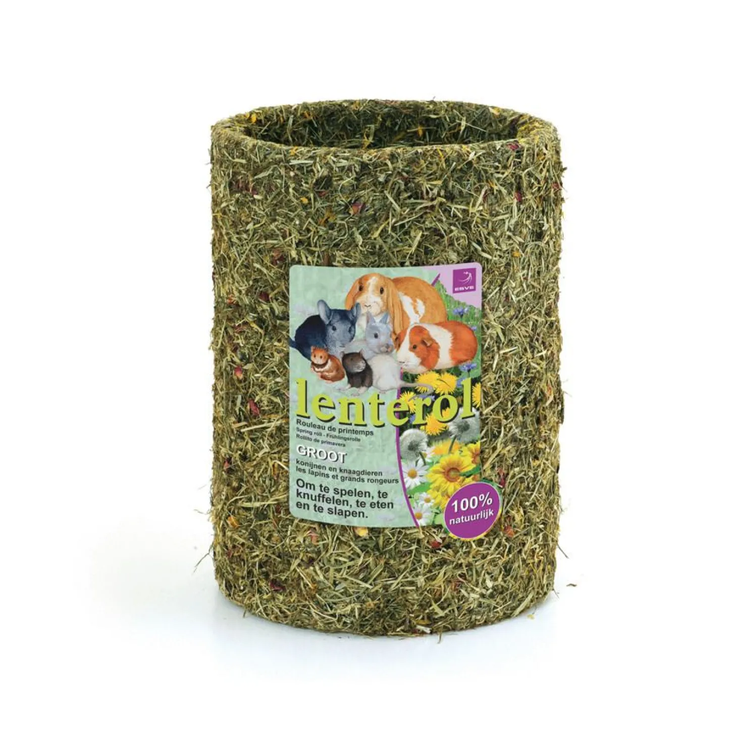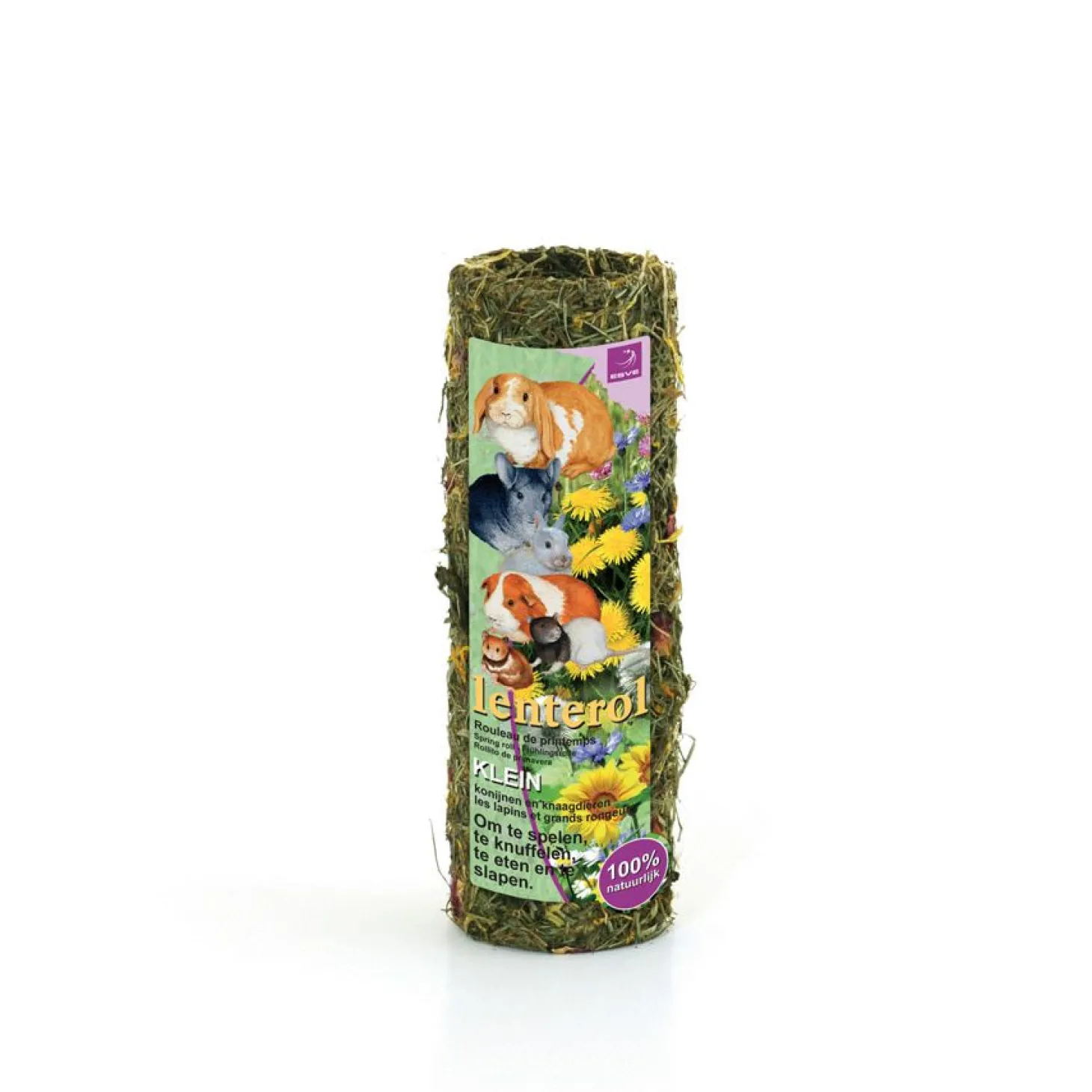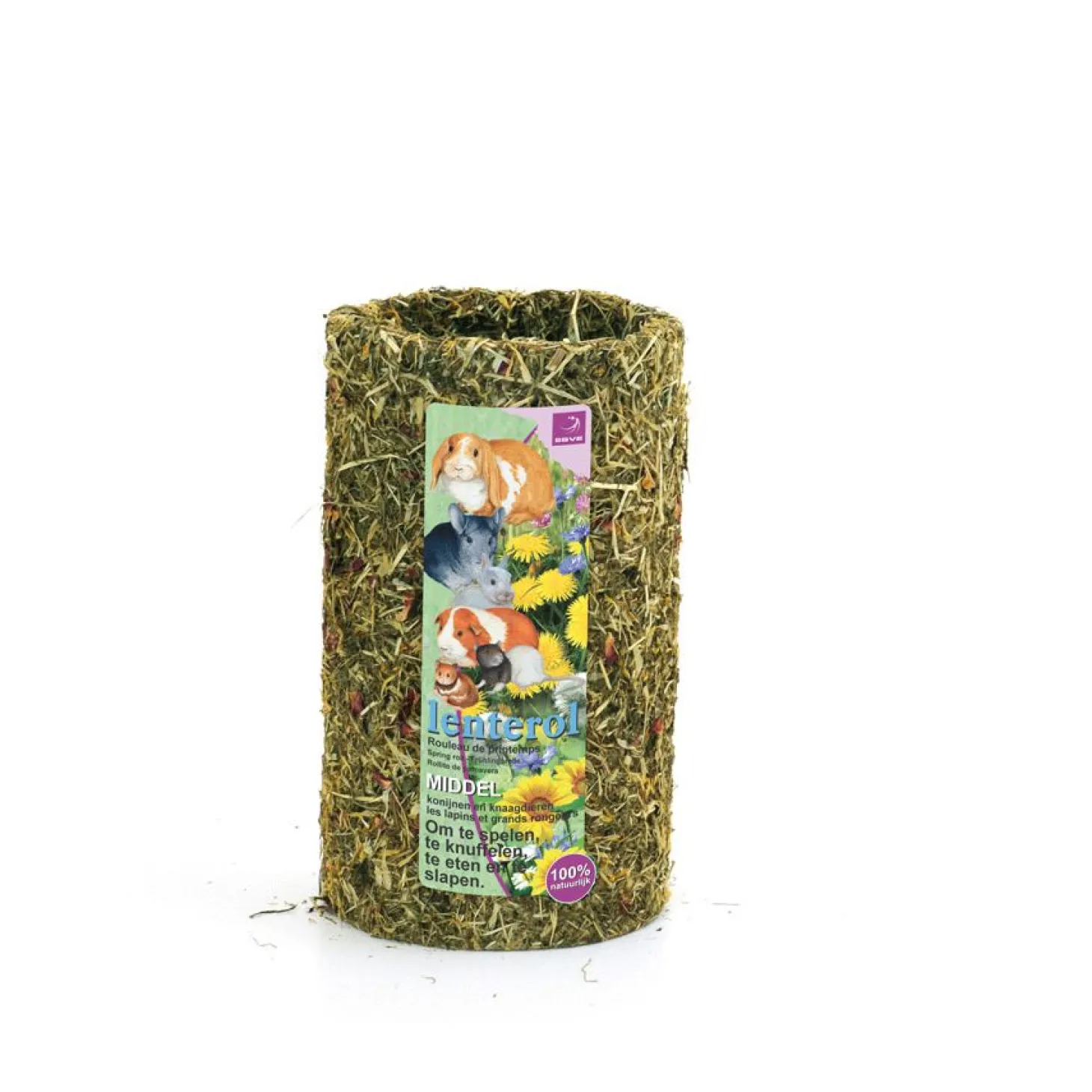 Om te voorkomen dat je knager zich verveelt, kan je zijn kooi verrijken met speelgoed of hem verwennen met wat lekkers. De Lenterol van ESVE is een leuke rol voor in het verblijf van je dier waar je hij in kan schuilen, mee kan spelen én die hij kan opeten. De rol is gemaakt van 100% natuurlijke materialen, zonder kunstmatige kleefstoffen. Het bevat bloemen en kruiden (bergweidehooi, goudsbloemen, pepermuntplant en rozenbloemen) en karton voor de stevigheid.