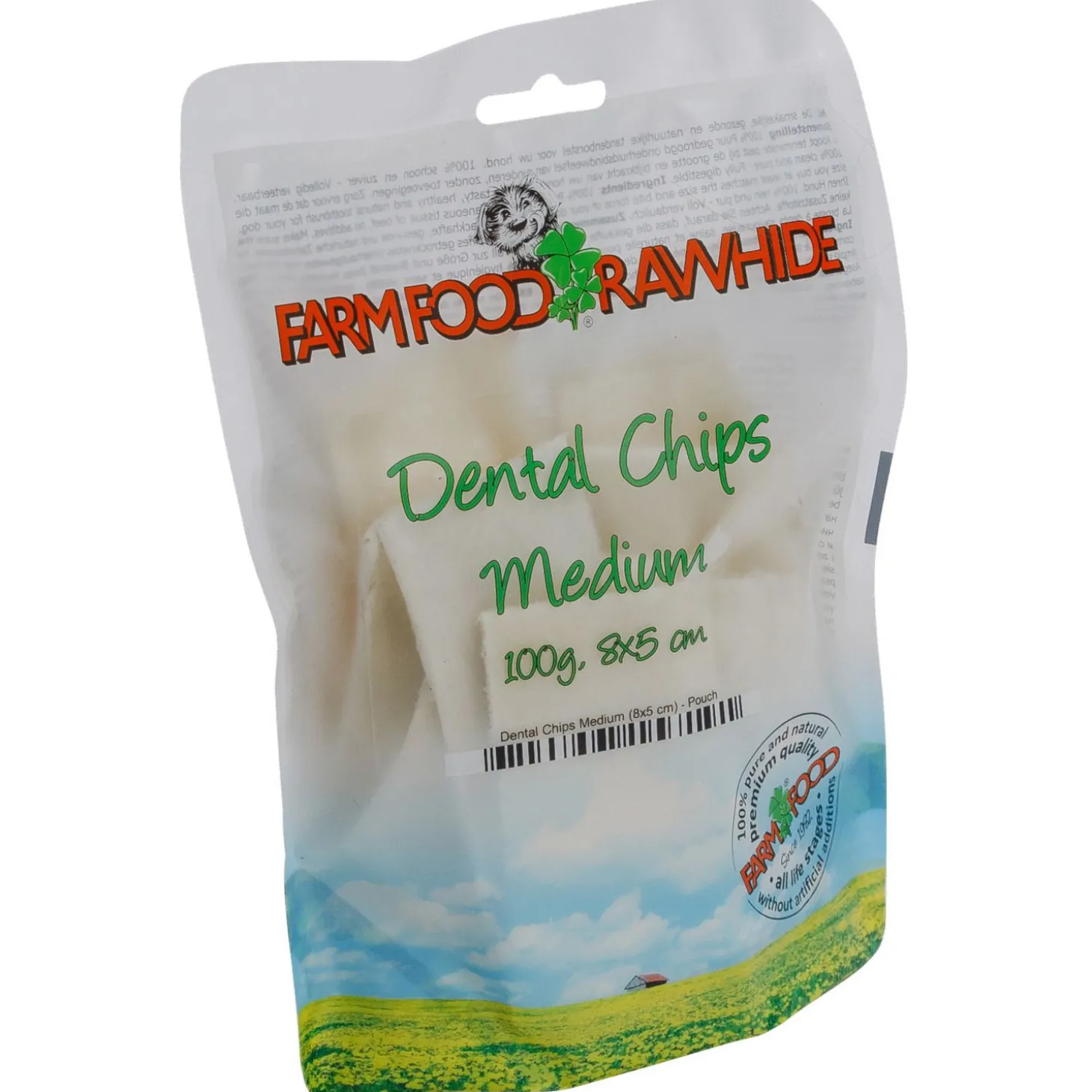 Gebitsproblemen komen bij honden veel voor. Het is belangrijk dat je hond zijn tanden schoon houdt. Met Rawhide Dental Chips Medium van Farm Food kan je problemen aan het gebit grotendeels voorkomen. Deze Chips bestaan uit 100% puur gedroogd onderhuids bindweefsel van runderen, zonder kleur-, geur– en smaakstoffen of conserveringsmiddelen.