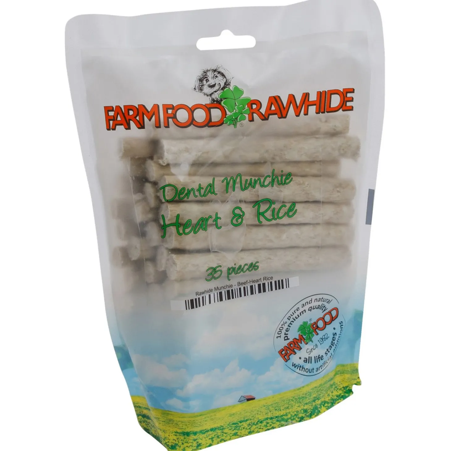 Gebitsproblemen komen bij honden veel voor. Het is belangrijk dat je hond zijn tanden schoon houdt. Met Rawhide Dental Munchie Heart & Rice van Farm Food kan je problemen aan het gebit grotendeels voorkomen. De Munchies bestaan uit 77% puur gedroogd onderhuids bindweefsel van runderen met 15% rijst en 8% runderhart, zonder kleur-, geur– en smaakstoffen of conserveringsmiddelen.