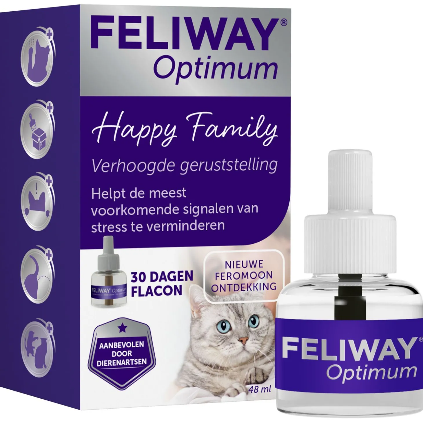 Wanneer jouw Feliway Optimum na 30 dagen zijn werking verliest, kan je het apparaat bijvullen met de Feliway Optimum Navulling. Feliway bevat de béste kattenferomonen om alle tekenen van stress aan te pakken en je kat beter dan ooit te kalmeren. Het zorgt voor een veilig en vertrouwd gevoel, biedt geruststelling en zorgt voor harmonie tussen meerdere katten in huis.