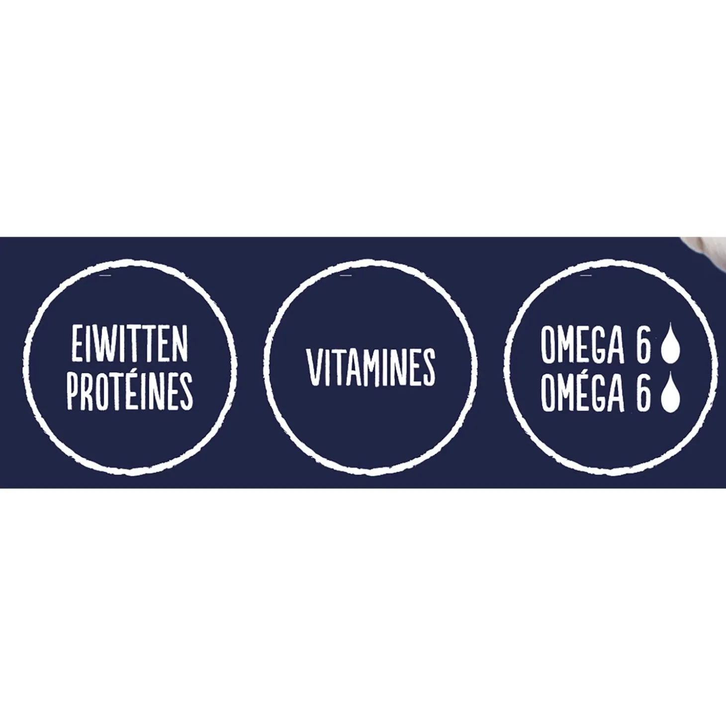 | Samenstelling | Samenstelling:Granen, Vlees en dierlijke bijproducten, Oliën en vetten, Plantaardige eiwitextracten, Vis en visbijproducten (waarvan 1% zalm, 1% forel), Mineralen, Gist, Groenten. |