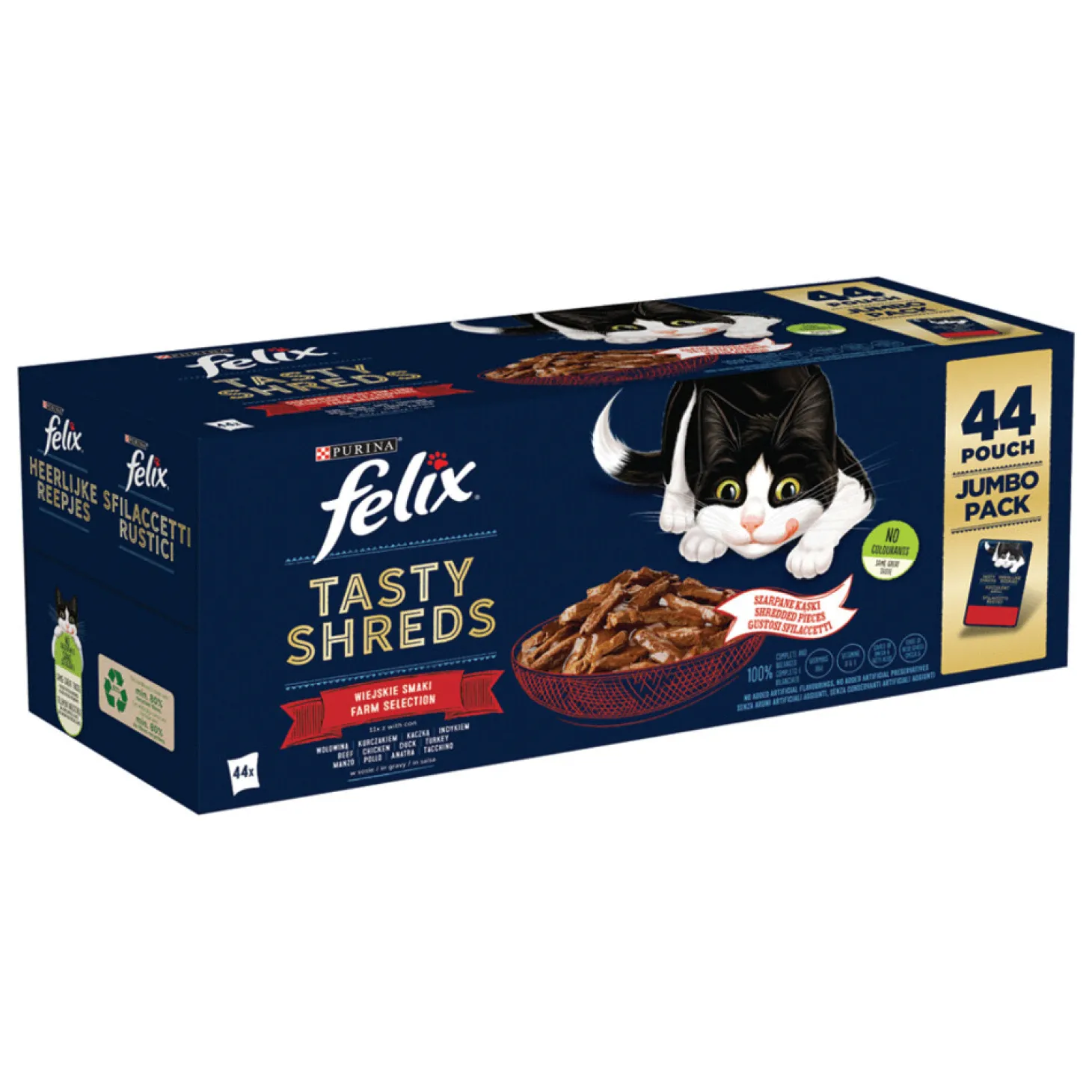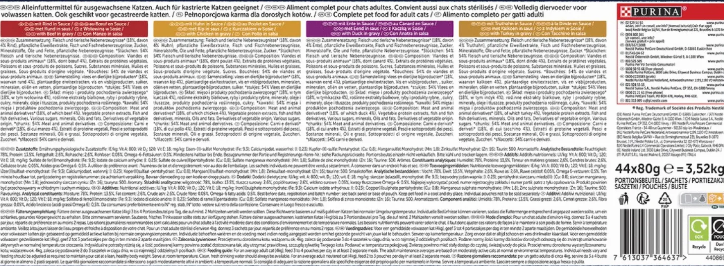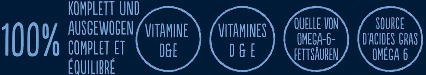 | Samenstelling | Met Rund: Samenstelling: vlees en dierlijke bijproducten* (18%, waarvan rund 4%), plantaardige eiwitextracten, vis en visbijproducten, suiker, mineralen, oliën en vetten, plantaardige bijproducten. *stukjes: 54% vlees en dierlijke bijproducten. Met Kip: Samenstelling: vlees en dierlijke bijproducten* (18%, waarvan kip 4%), plantaardige eiwitextracten, vis en visbijproducten, mineralen, oliën en vetten, plantaardige bijproducten, suiker. *stukjes: 54% vlees en dierlijke bijproducten. Met Eend: Samenstelling: vlees en dierlijke bijproducten* (18%, waarvan eend 4%), plantaardige eiwitextracten, vis en visbijproducten, suiker, mineralen, oliën en vetten, plantaardige bijproducten. *stukjes: 54% vlees en dierlijke bijproducten. Met Kalkoen: Samenstelling: vlees en dierlijke bijproducten* (18%, waarvan kalkoen 4%), plantaardige eiwitextracten, vis en visbijproducten, mineralen, oliën en vetten, plantaardige bijproducten, suiker. *stukjes: 54% vlees en dierlijke bijproducten. |