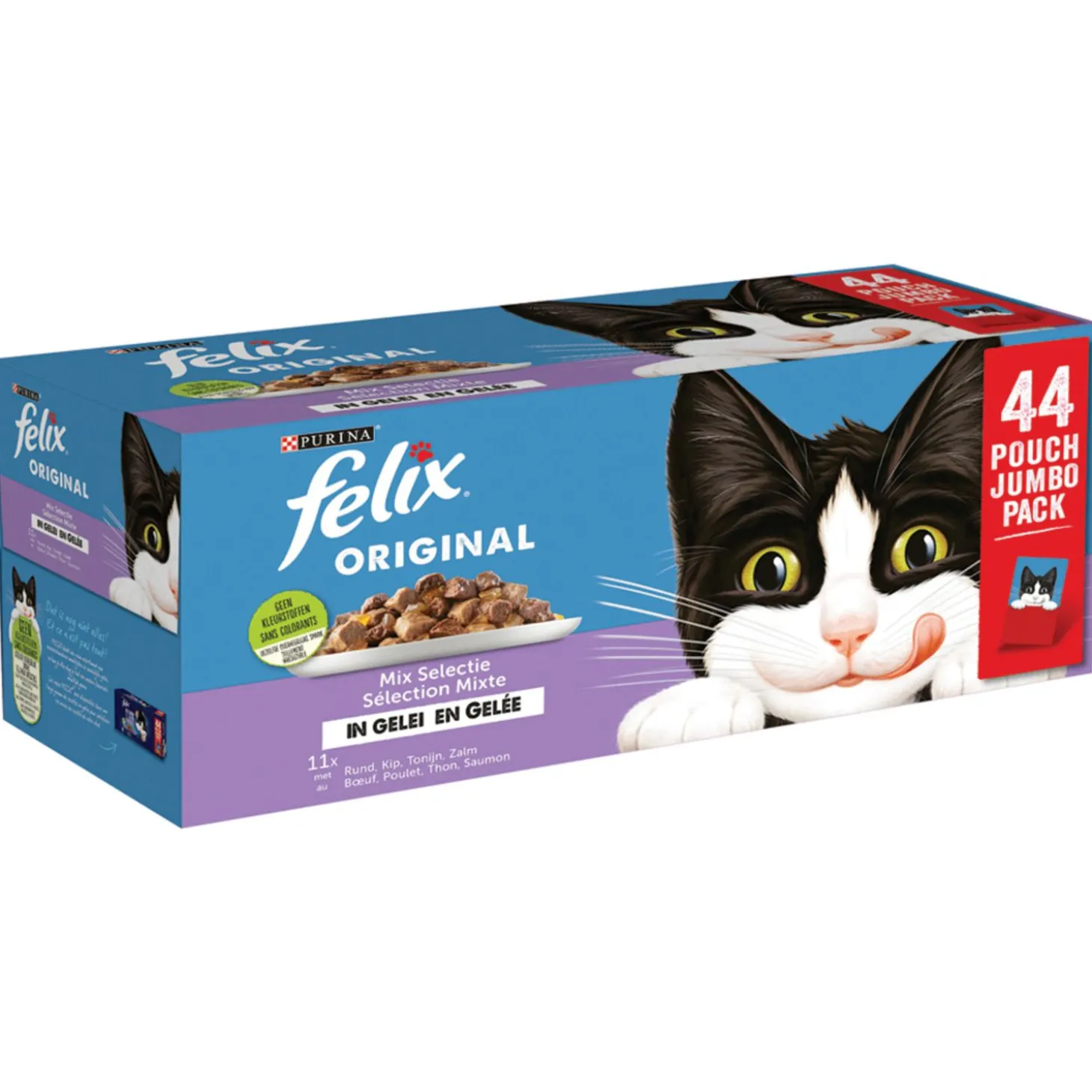 Wat is er nou lekkerder dan de natvoersensaties van Felix? De Felix Original Mix Selectie in Gelei bevat 44 maaltijdzakjes die gevuld zijn met vlezige brokken in combinatie met een onweerstaanbare gelei.
