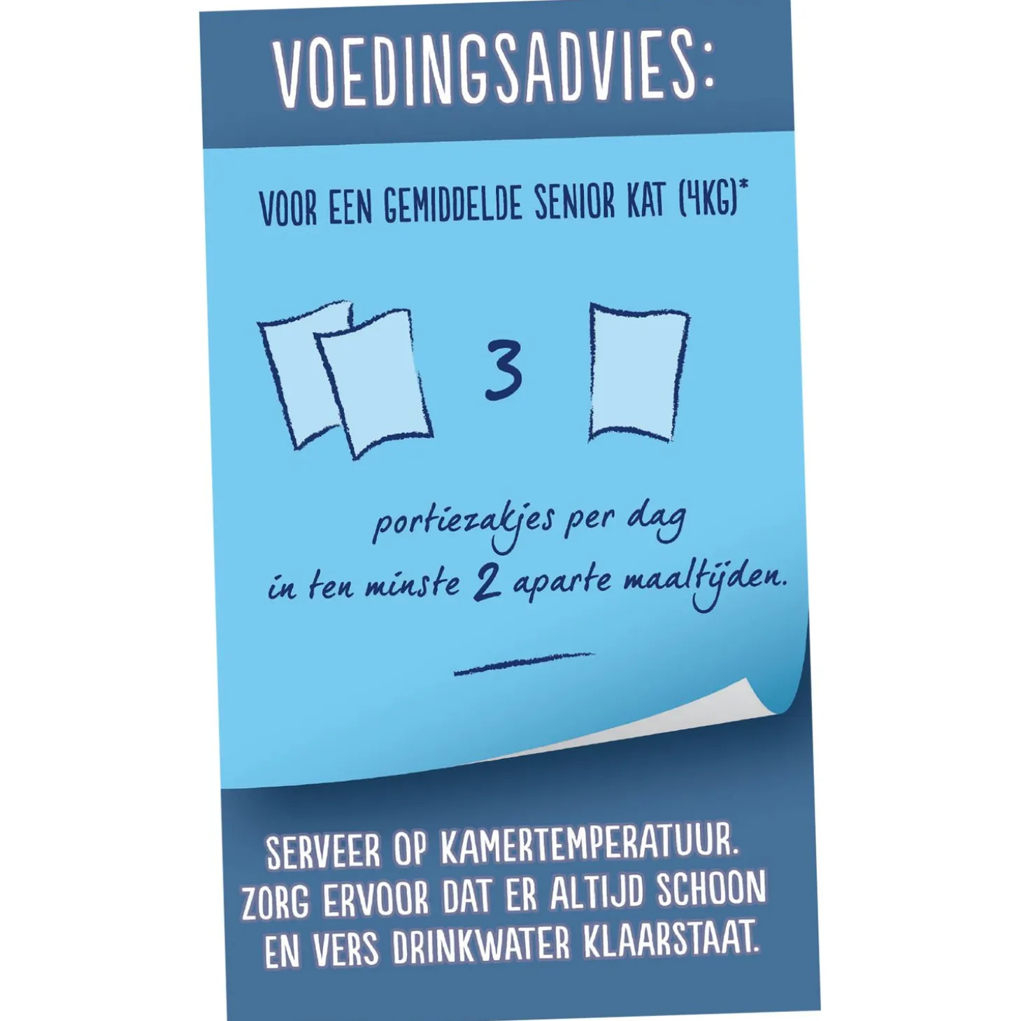| Aanbeveling | Voedingsadvies: Voor een gemiddelde senior kat (4kg), geef 2 tot 3 portiezakjes per dag in ten minste 2 aparte maaltijden. De gemiddelde hoeveelheden voor senior katten zijn gebaseerd op gemiddeld actieve katten bij normale omgevingstemperaturen. Individuele behoeften variëren en de voeding moet indien nodig worden aangepast om jouw kat op een slank, gezond lichaamsgewicht te houden. Serveer op kamertemperatuur. Zorg ervoor dat er altijd schoon en vers drinkwater klaarstaat. |