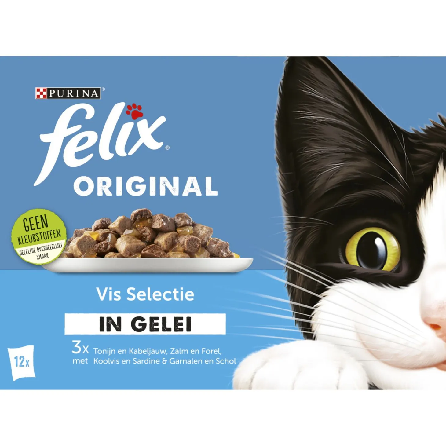 Wat is er nou lekkerder dan de natvoersensaties van Felix? De Felix Original Vis Selectie in Gelei bevat 12 maaltijdzakjes die gevuld zijn met vlezige brokken in combinatie met een onweerstaanbare gelei.