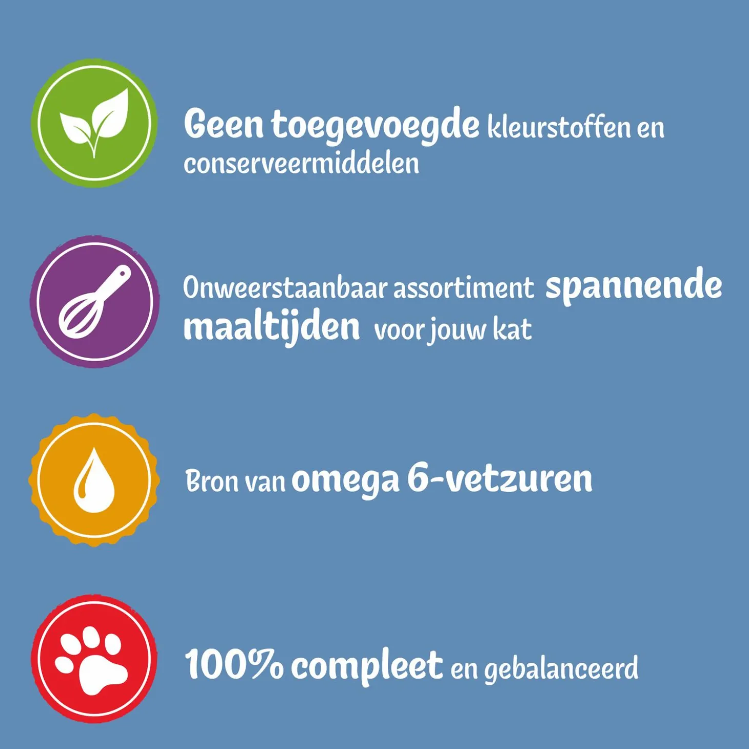 Uiteraard zit het natvoer boordevol voedingstoffen voor een gezond leven. Denk aan omega 6-vetzuren en andere onmisbare vitaminen en mineralen; zoals vitamines D en E. En dat alles zonder toegevoegde kunstmatige smaak- en kleurstoffen of conserveringsmiddelen.