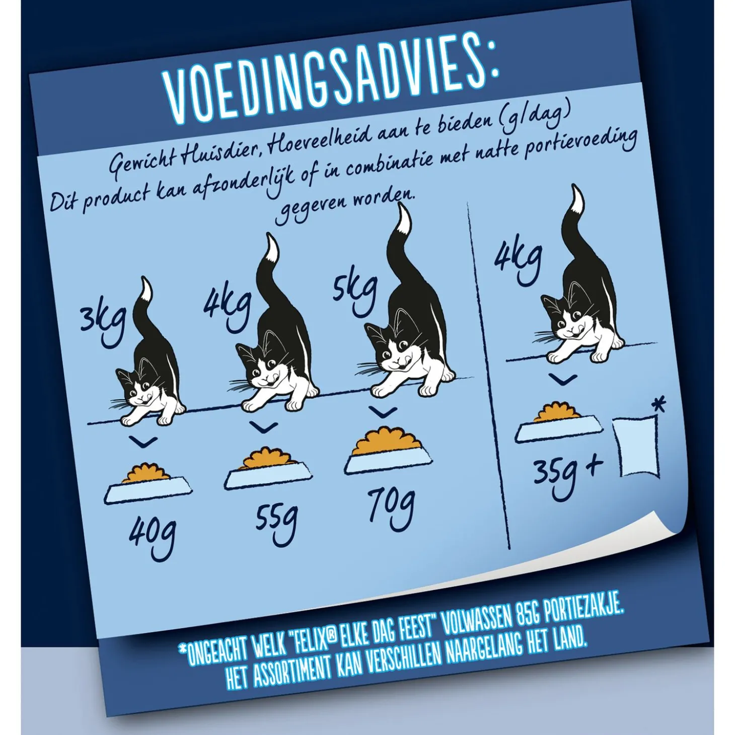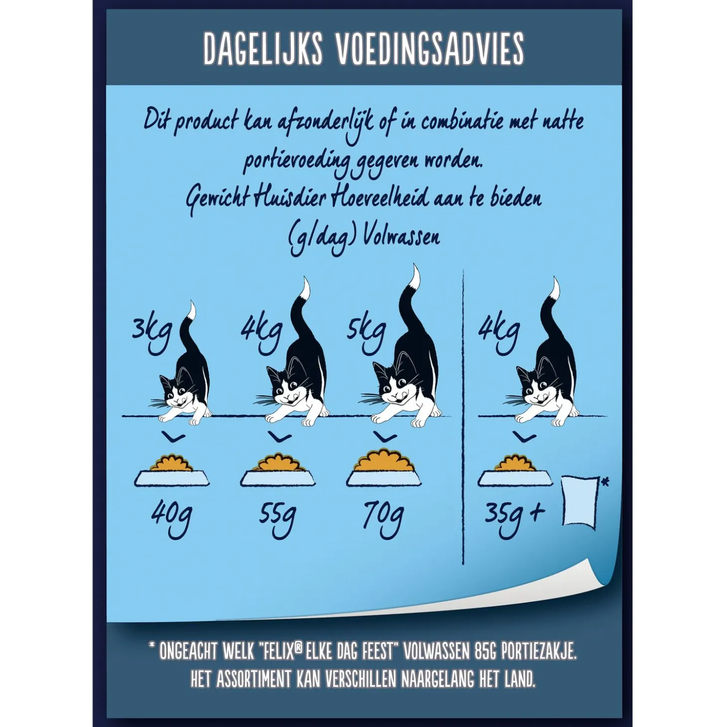 | Aanbeveling | De gemiddelde hoeveelheden voor senior katten zijn gebaseerd op matig actieve katten bij normale omgevingstemperaturen. Individuele behoeften verschillen echter en de voeding dient hierop te worden aangepast om de kat op een slank, gezond lichaamsgewicht te houden. Zorg er voor dat er altijd vers, schoon drinkwater klaar staat. Voldoende waterconsumptie is een noodzakelijk onderdeel van een dagelijkse gezonde voeding.Dagelijks voedingsadvies: Het product kan afzonderlijk of in combinatie met natte portievoeding gegeven worden. Gewicht huisdier hoeveelheid aan te bieden (g/dag) volwassen:Gewicht van 3kg: 40g droogvoedingGewicht van 4kg: 55g droogvoedingGewicht van 5kg: 70g droogvoedingGewicht van 4kg: 35g droogvoeding + 1x nat portiezakje**ongeacht welk “Felix Elke Dag Feest” Volwassen 85g portiezakje. Het assortiment kan verschillen naargelang het land. |