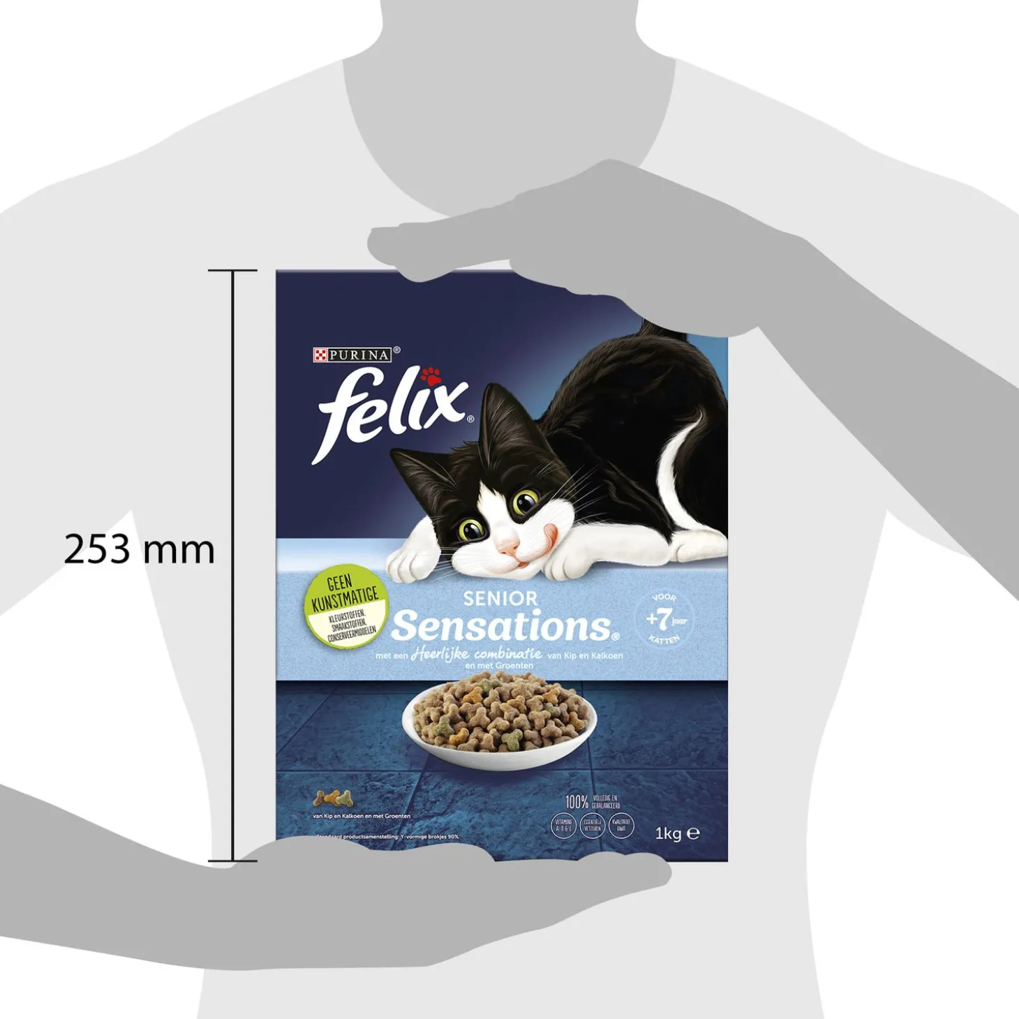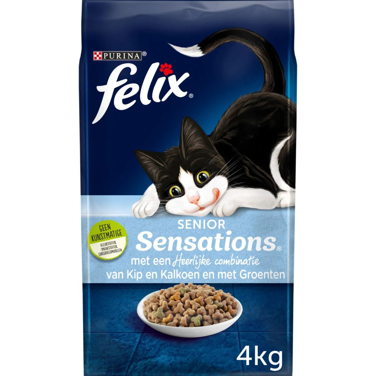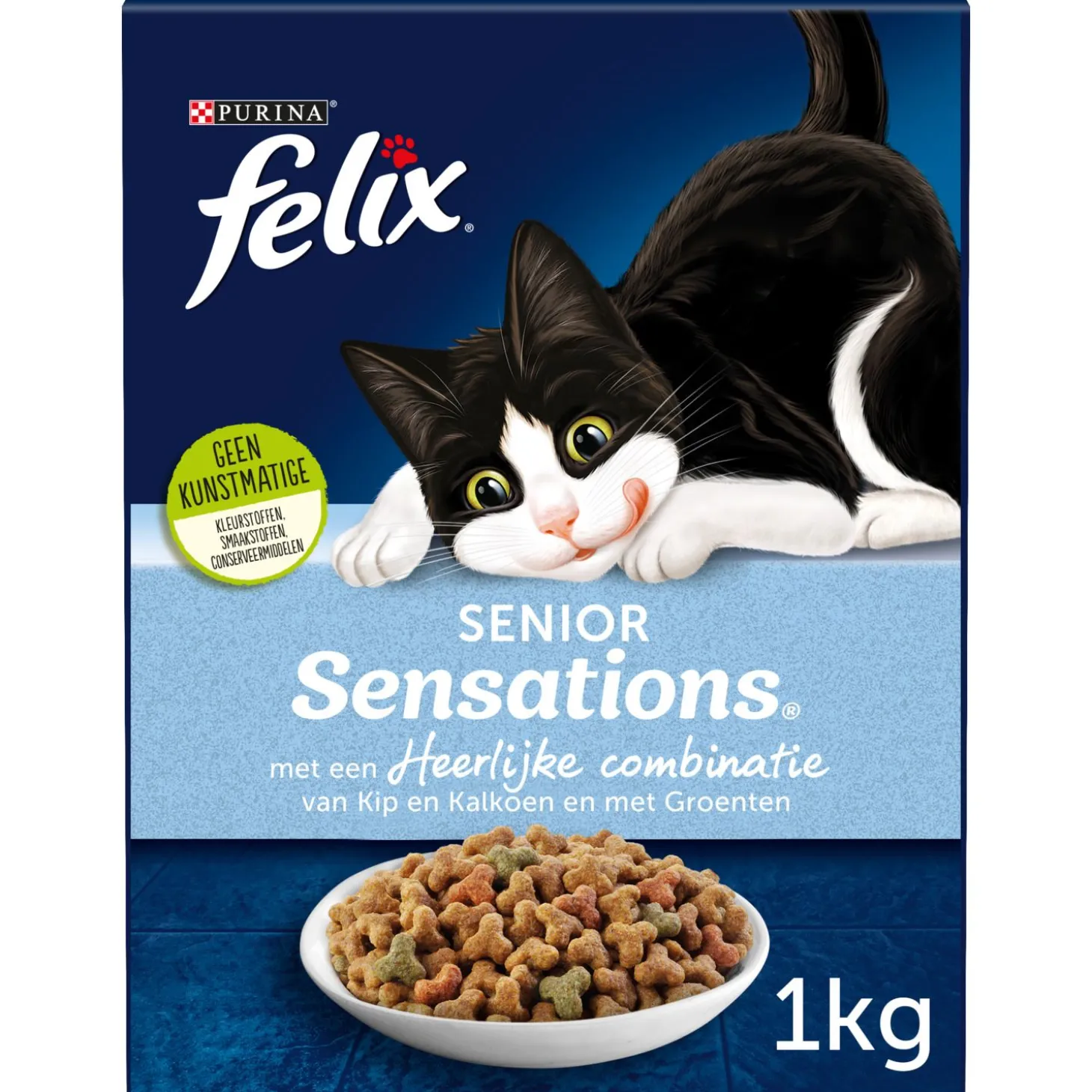 Natuurlijk moeten kattenbrokjes lekker smaken, maar wat dacht je van de geur en het uiterlijk? De Felix Senior Sensations brokken zien er leuk uit, en ruiken en smaken heerlijk voor jouw oudere kat. De vrolijk gekleurde brokjes zijn rijk van smaak én bevatten natuurlijk alle voedingstoffen die je kat nodig heeft voor een gezond leven. Speciaal voor senior katten (vanaf 7 jaar oud), met kip en groente.