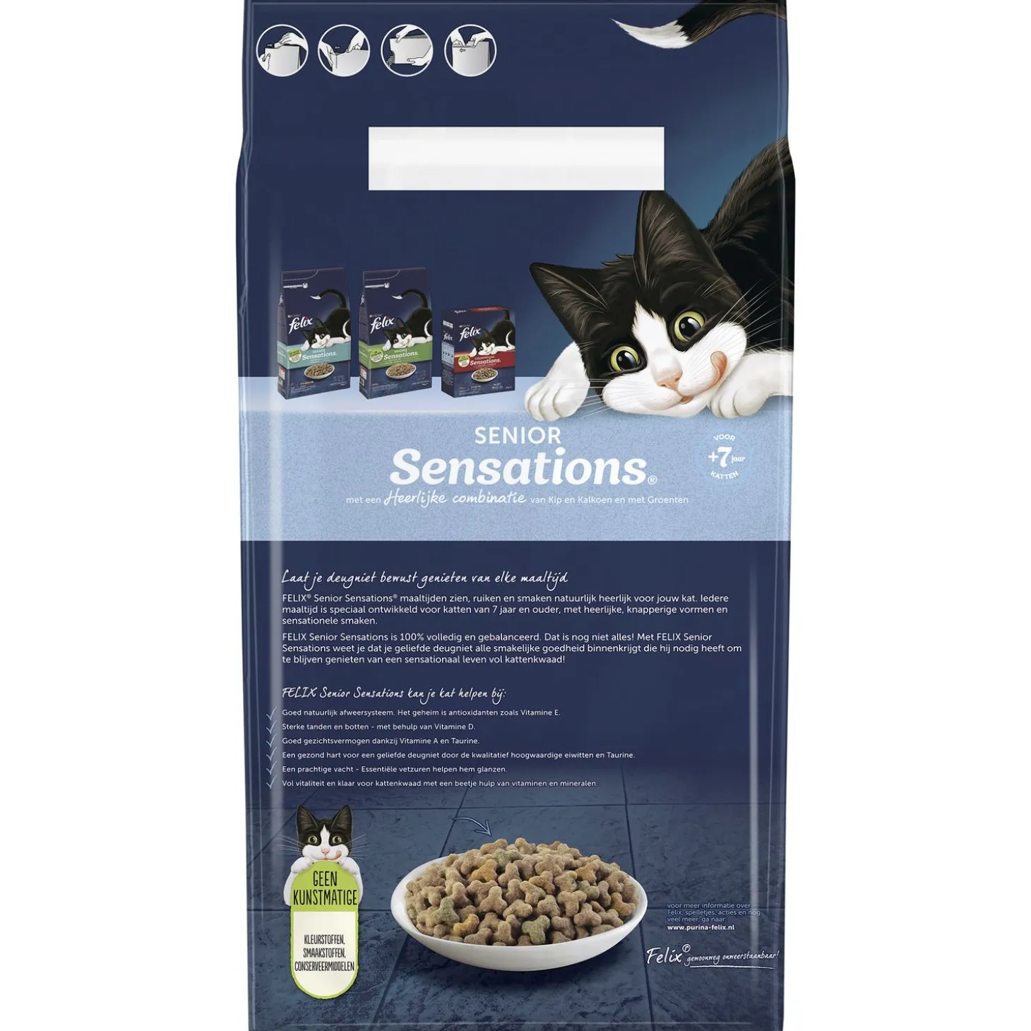Natuurlijk moeten kattenbrokjes lekker smaken, maar wat dacht je van de geur en het uiterlijk? De Felix Senior Sensations brokken zien er leuk uit, en ruiken en smaken heerlijk voor jouw oudere kat. De vrolijk gekleurde brokjes zijn rijk van smaak én bevatten natuurlijk alle voedingstoffen die je kat nodig heeft voor een gezond leven. Speciaal voor senior katten (vanaf 7 jaar oud), met kip en groente.