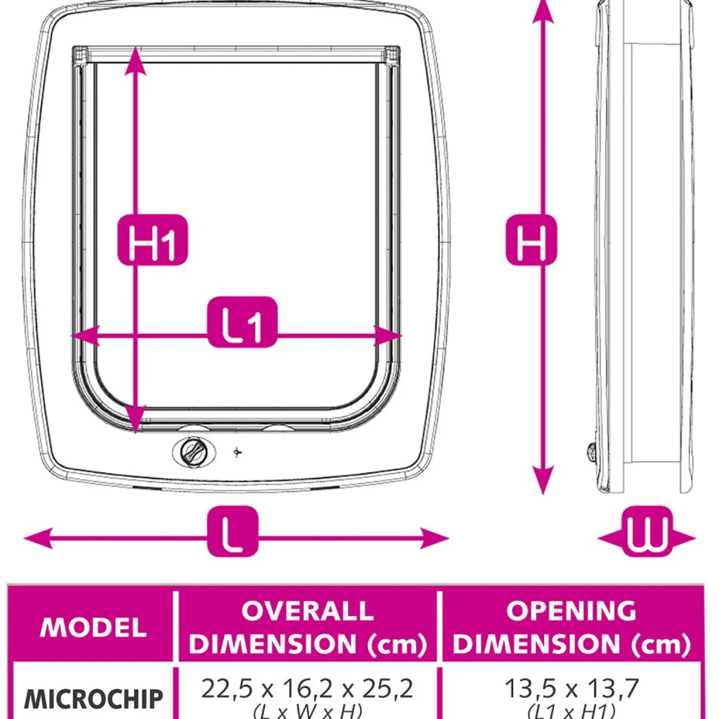Het Dierenluik Swing Microchip is wit van kleur en heeft een afmeting van 22,5 x 16,2 x 25,2 cm. Het luikje zelf heeft een formaat van 13,5 x 13,7 cm.
