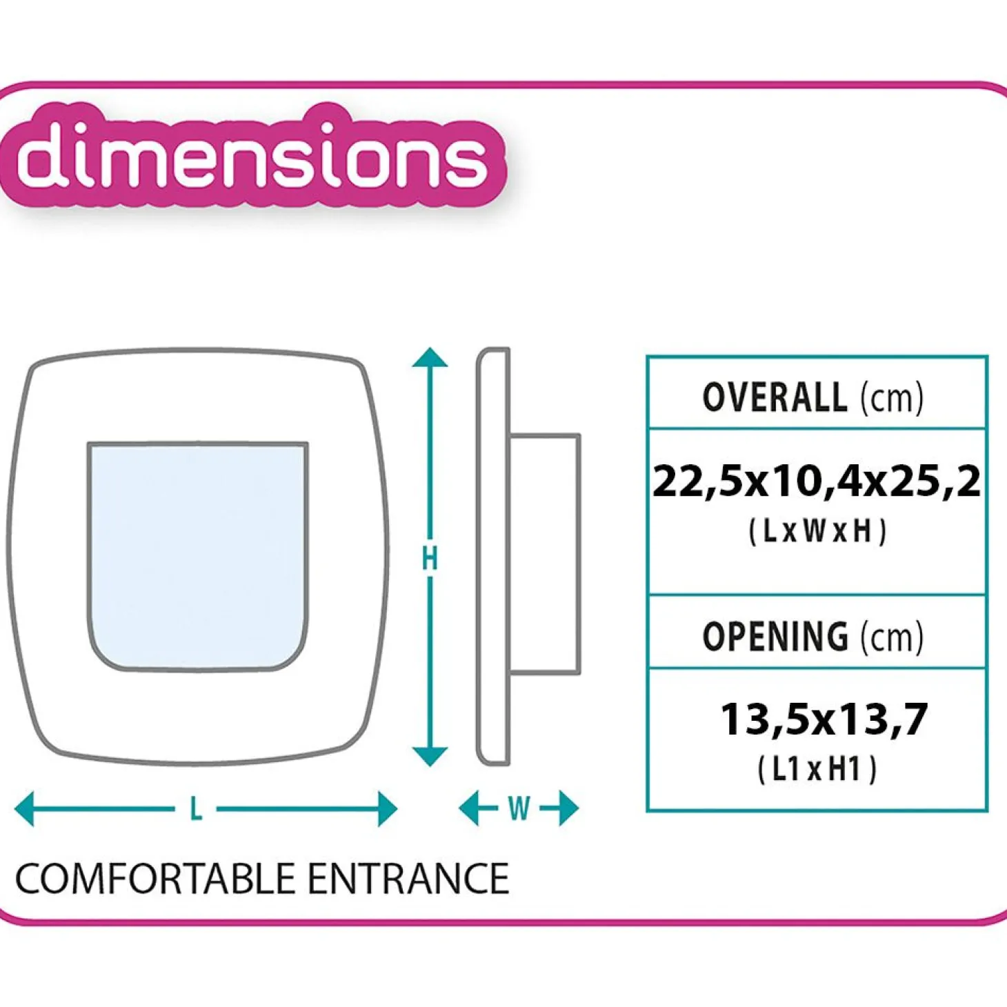 Het Dierenluik Swing is verkrijgbaar in vijf varianten, kijk voor de afmetingen in de afbeelding van het gewenste luik: