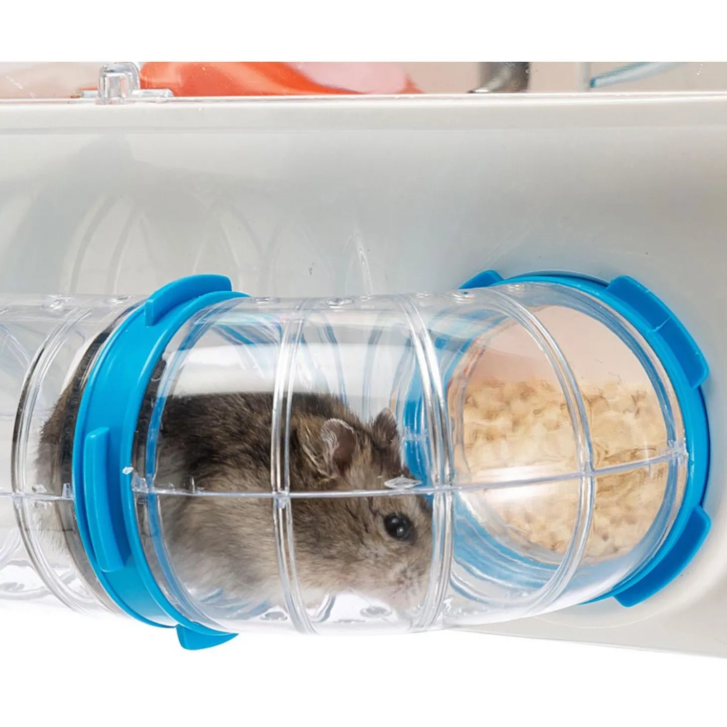 Deze kooi is klein maar bevat wel alles wat je hamster nodig heeft. De kooi heeft een transparante bovenkant met een praktisch traliedak voor ventilatie. Bij deze kooi zitten een voerbakje, huisje, looprad, drinkflesje en speelbuizen inbegrepen. De onderkant kan worden losgehaald zodat de kooi eenvoudig schoon kan worden gemaakt.