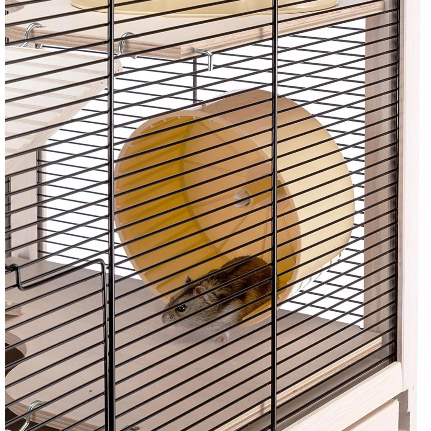 De Hamsterville is een mooie houten kooi voor je knaagdier. De kooi is praktisch en comfortabel en biedt veel ruimte door middel van de vier verschillende verdiepingen. Dankzij de verschillende plateaus kan je knager deze kooi op verschillende manieren verkennen en komt hij ook nog eens aan genoeg beweging toe. De plateaus zijn te bereiken met de bijgevoegde ladders, deze zijn allen bewerkt zodat ze waterdicht zijn en gemakkelijk schoon zijn te houden.