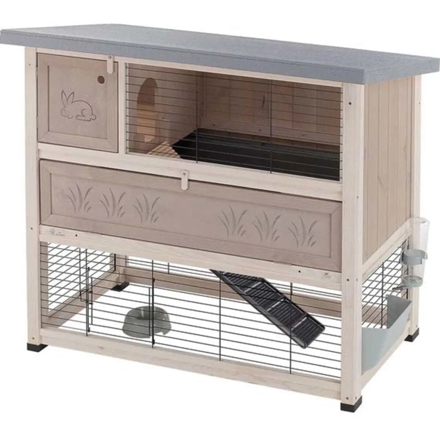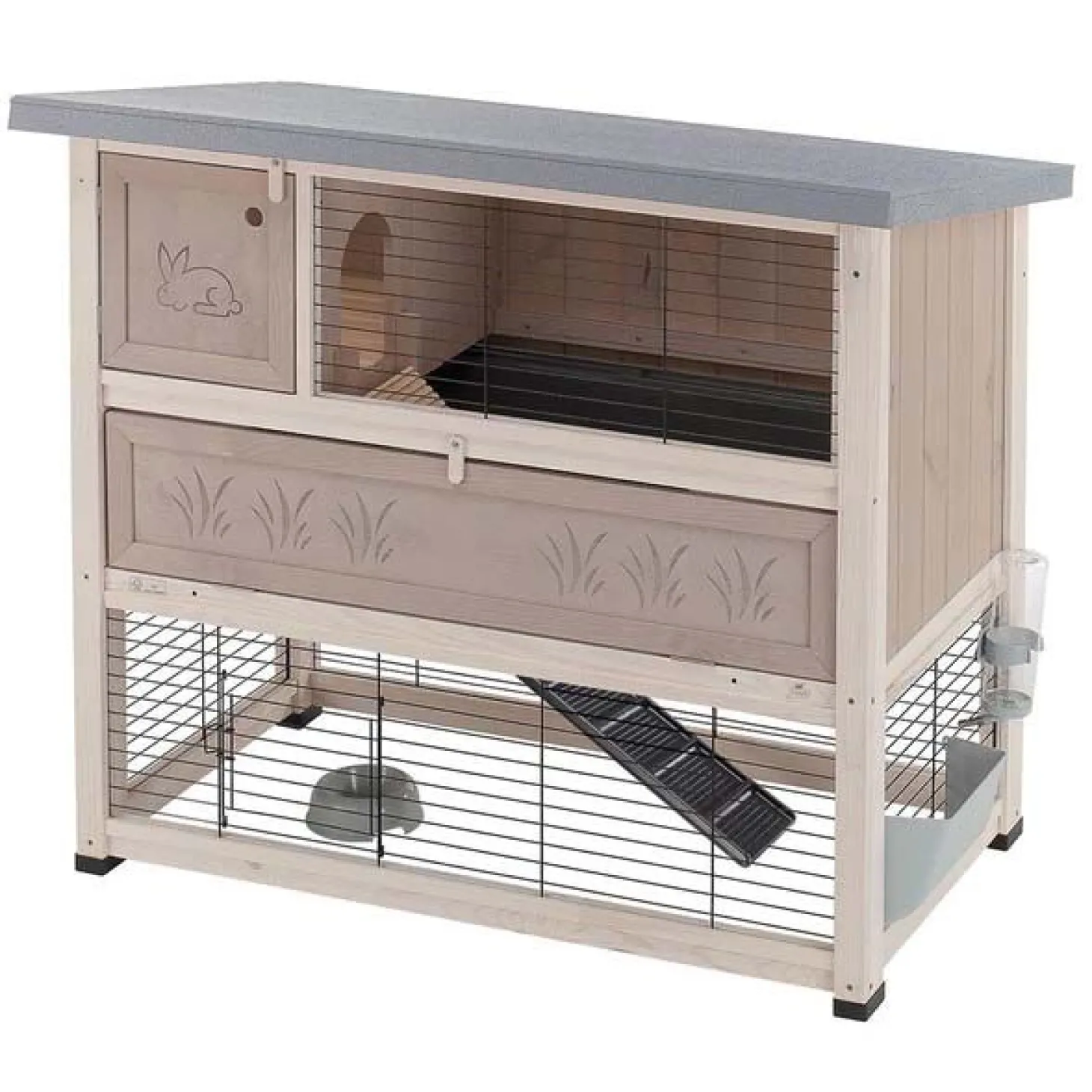 Het nachthok is gemaakt van hout en heeft een handig te openen zijdeur zodat je makkelijk bij het verblijf kan komen en het beschikt over een efficiënt en veilig sluitsysteem. De onderste helft van het hok dient als een ren waarin je konijnen vrij kunnen spelen, eten en drinken. Via het schuifdeurtje kunnen je konijnen uit het verblijf en kunnen ze vrij rondlopen in je tuin of huis.