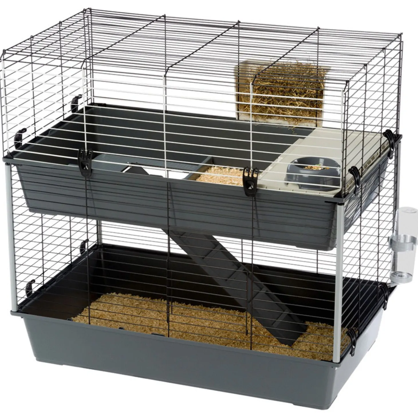 De Rabbit 100 Dubbel is een complete kooi en wordt inclusief voerbakje, waterflesje en hooiruif geleverd. Verder bevat de kooi een extra plateau, zo kan je dier de leefruimte optimaal benutten. Dit plateau fungeert ook gelijk als huisje waar je dier veilig en beschut onder kan schuilen en slapen. Door middel van een ladder kan je dier van de eerste naar de tweede verdieping lopen.