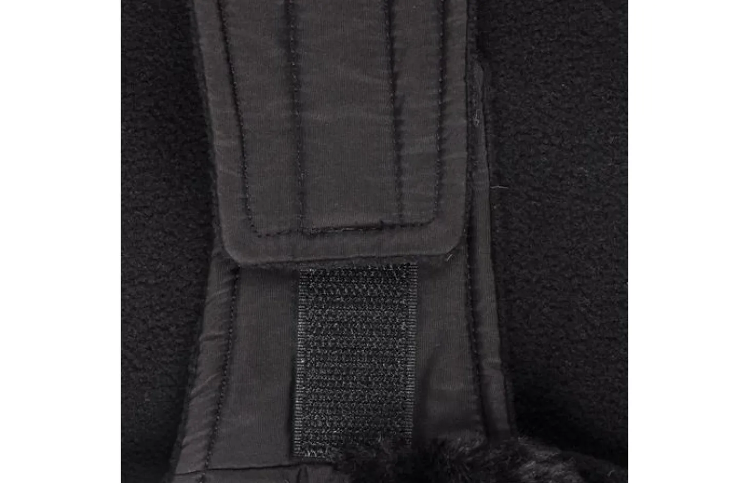 Je maakt de jas eenvoudig vast met klittenband bij de buik en nek. Bij de nek zit een kleine opening waar je de riem doorheen kunt doen. Op de rug vind je een zachte, zwarte fleecestof en een extra strikje als decoratie bij de kraag. De jas kan op 30 graden gewassen worden.