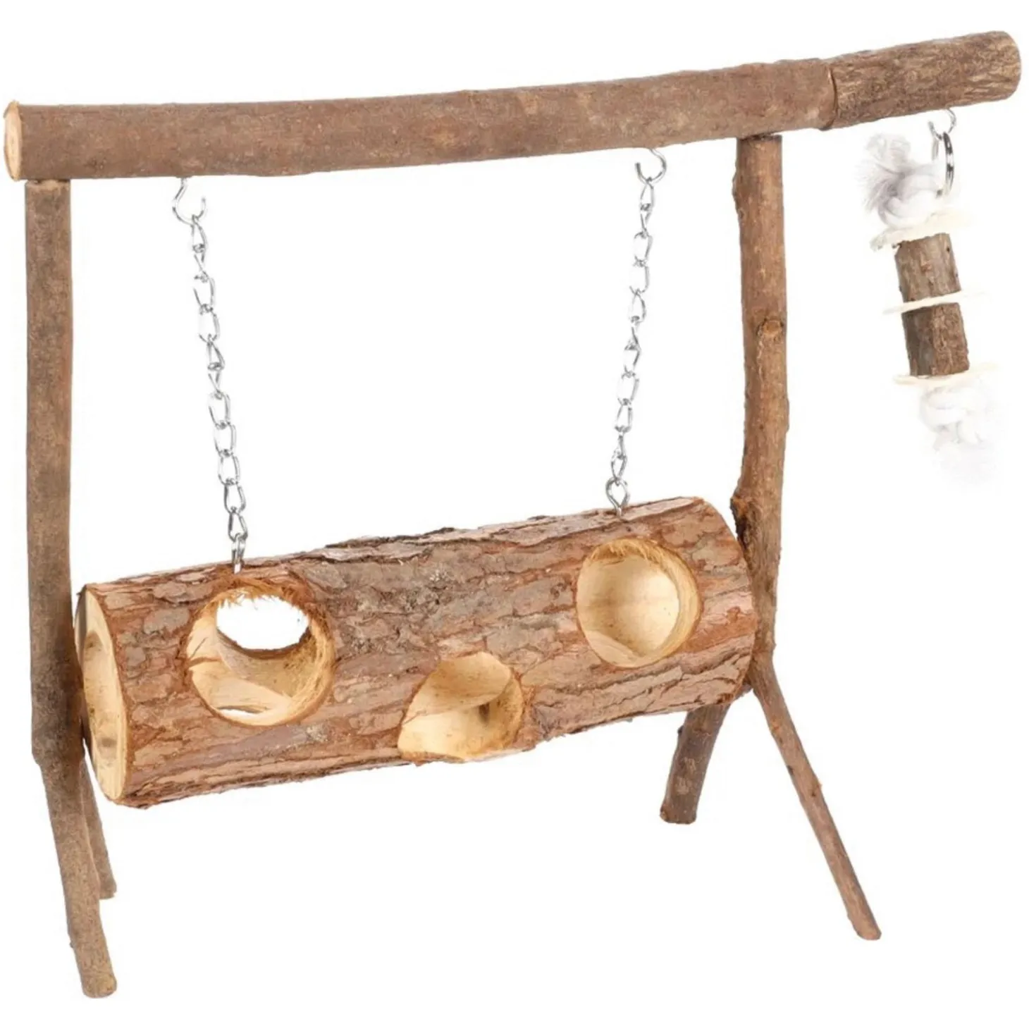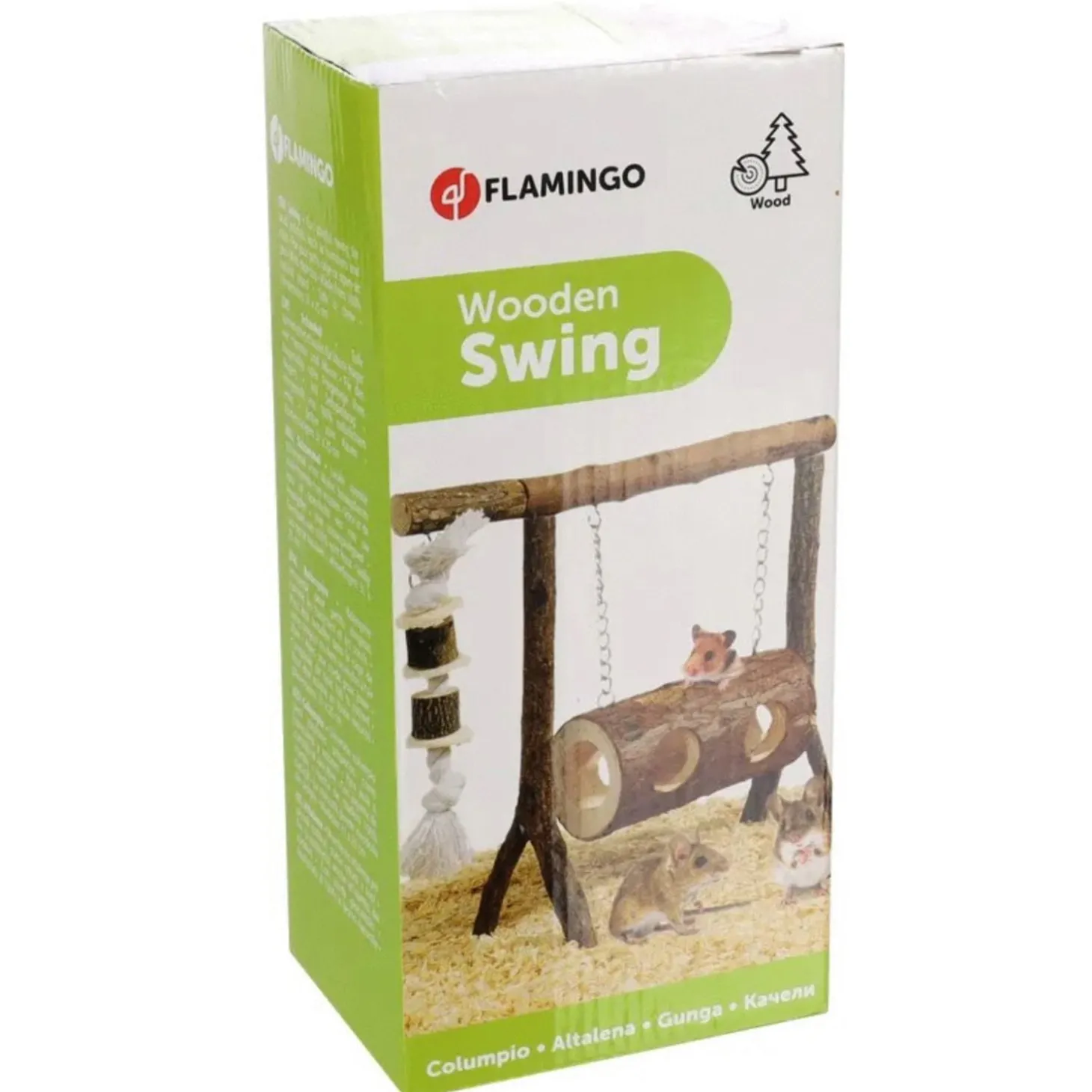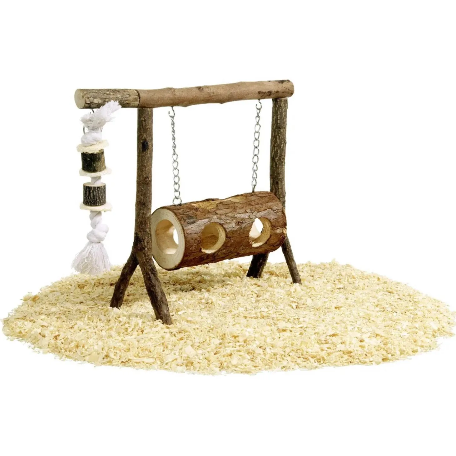 Deze schommel van Flamingo is een ideale speeltuin voor jouw kleine knaagdier(en) waar hij diverse dingen mee kan doen. Jouw knager kan door de tunnel met gaten kruipen, op de schommel klauteren of in het touw klimmen. Als het verblijf groot genoeg is kan je de schommel in het verblijf plaatsen, maar je kunt hem ook gewoon buiten het verblijf plaatsen. Zo kan jouw knager de schommel ontdekken wanneer hij een blokje om maakt.