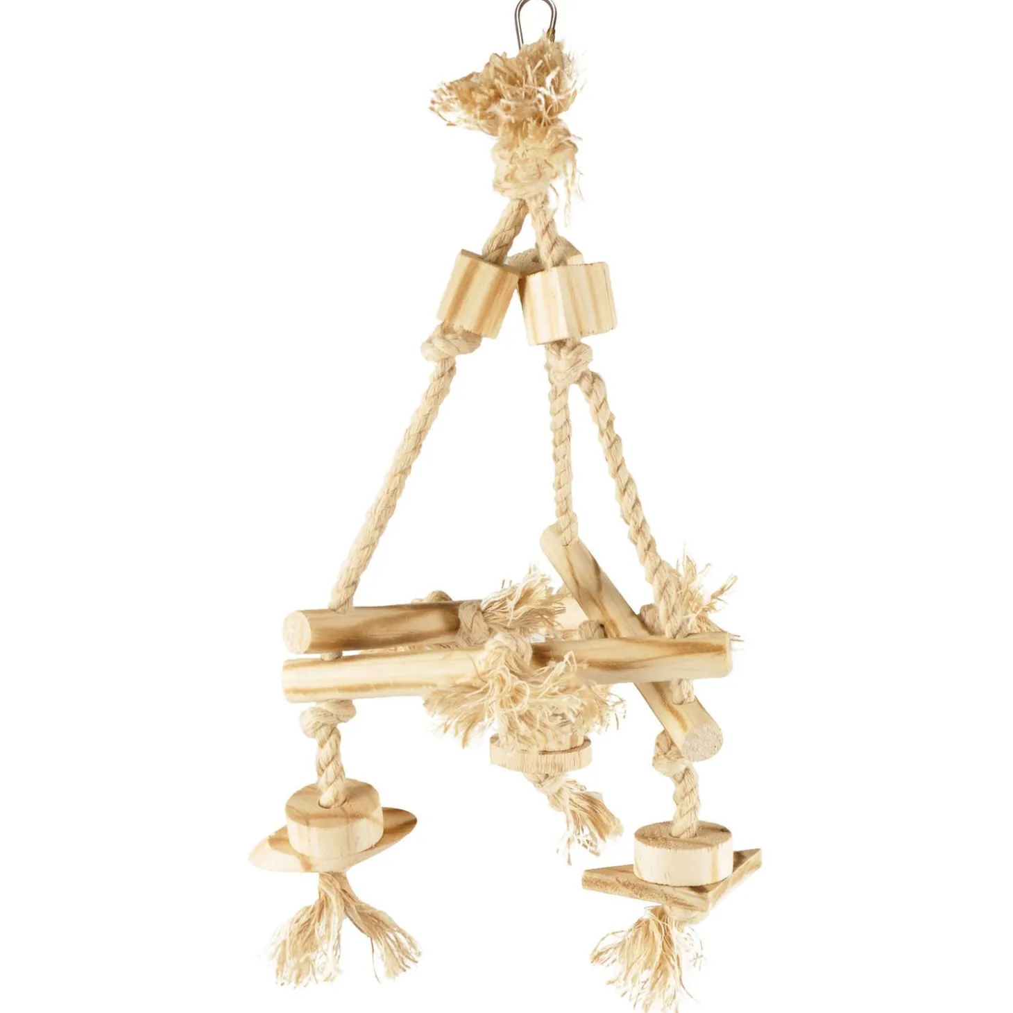 Let op: vogels staan erom bekend dat ze hun omgeving verkennen en onderzoeken met hun snavels. Dit natuurlijke gedrag wordt vaak versterkt in gevangenschap, waar ze de neiging hebben om aan verschillende objecten en oppervlakken te knabbelen. Hierdoor kunnen onderdelen breken of loslaten, waardoor een vogel vast kan blijven zitten of zich open kan halen. Touw kan slijtage vertonen of loslaten, waardoor vogels verstrikt kunnen raken of het in de krop terecht komt. Door regelmatig de accessoires in de kooi te controleren, kan je ervoor zorgen dat jouw vogel een veilige en stimulerende omgeving heeft waarin hij/zij vrij kan bewegen zonder onnodige bedreigingen.
