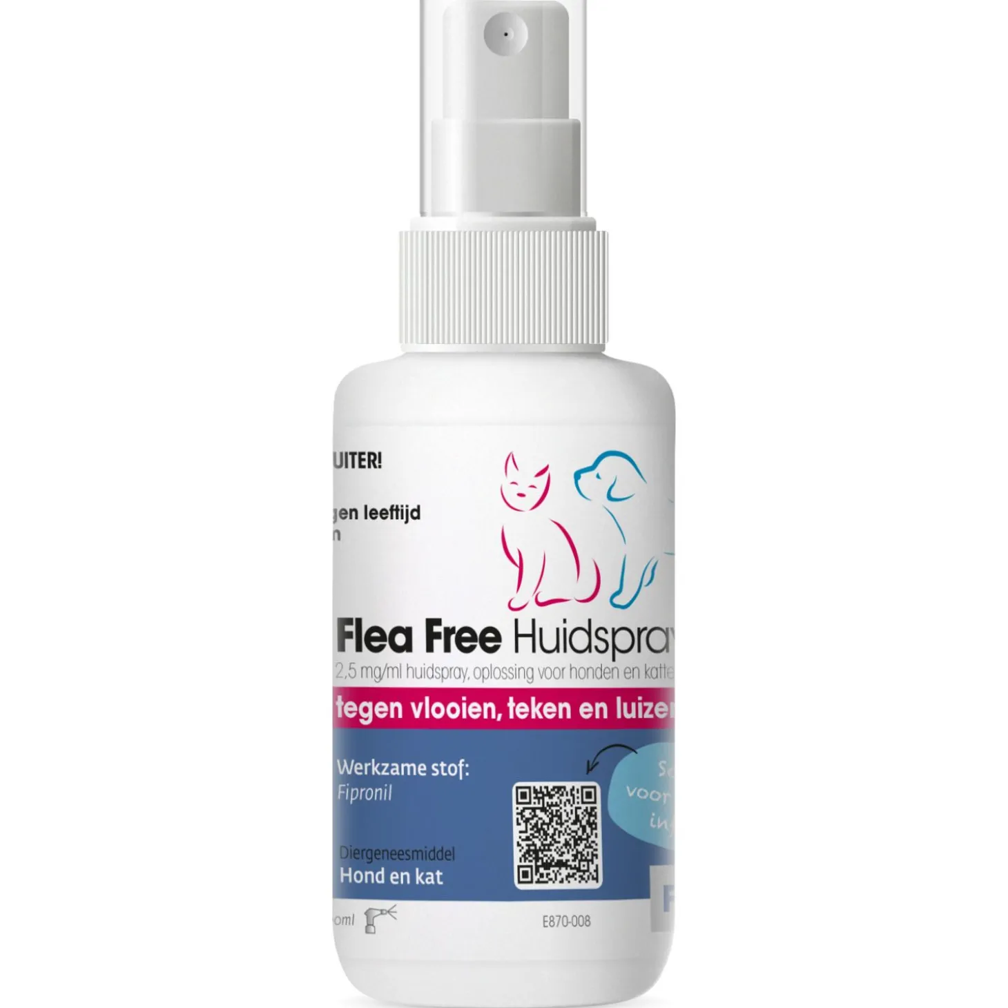 Vlooien, luizen en teken zijn irritante beestjes, ze jeuken en kriebelen en kunnen ook nog vervelende ziektes met zich mee dragen. Als je hond of kat er last van heeft, wil je ze dan ook zo snel mogelijk bestrijden. De Flea Free Huidspray helpt hierbij! Het is een teken- en vlooienspray met de werkzame stof Fipronil. Dit product heeft dezelfde werking als de Frontline spray. Na toediening van deze spray op de huid van jouw hond of kat is hij beschermt tegen vlooien (3 maanden bij honden en 6 weken bij katten) en teken (tot 4 weken). Daarnaast behandelt de huidspray ook infestaties met bijtende luizen.
