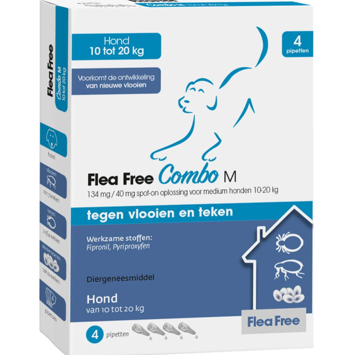 Voorkomen is beter dan genezen, zo ook met vlooien. Deze diertjes zijn vervelend en kunnen erg jeuken, als je niet uitkijkt vormen ze zelfs een hele plaag. Ook bestaande vlooien (en teken) wil je natuurlijk zo snel mogelijk bestrijden. Flea Free Spot-on Combo is een vlooien- en tekenpipet met de werkzame stoffen Fipronil en Pyriproxyfen. Deze vlooien- en tekenpipetten hebben dezelfde werking als Frontline spot-on Combo. Na toediening van deze handige drop-stop pipet is jouw hond of kat beschermd tegen vlooien (tot 7 weken bij honden en tot 5 weken bij katten) en teken (tot 4 weken bij honden en tot 1 week bij katten). De werkzame stof Fipronil doodt binnen 24 uur de aanwezige vlooien en binnen 48 uur de aanwezige teken op het dier. De werkzame stof Pyriproxyfen doet zijn werking in huis (de omgeving). Het voorkomt de ontwikkeling van vlooienlarven en -eieren in de omgeving. Zo voorkom je de ontwikkeling van een ernstige vlooienplaag.