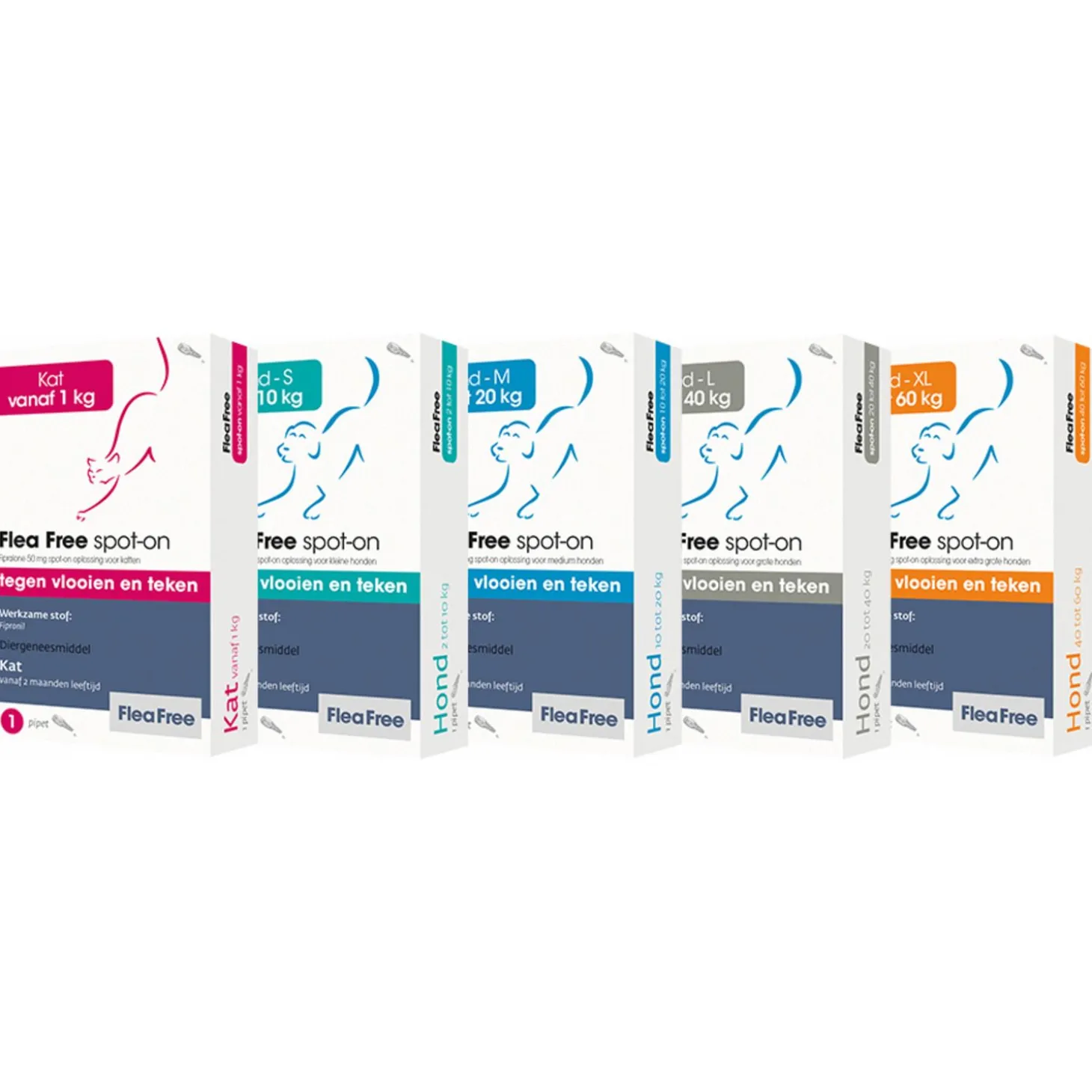 Vlooien en teken zijn irritante beestjes, ze jeuken en kriebelen en kunnen ook nog vervelende ziektes met zich mee dragen. Je wilt dus voorkomen dat je hond er last van heeft. Met Flea Free Spot-On dood je de vlooien die op je hond rondspringen. Flea Free Spot-On is een pipet met de werkzame stof Fipronil. Deze vlooienpipetten hebben dezelfde werking als Frontline Flea Free Spot-On. Na toediening van deze handig drop-stop pipet is je hond of kat beschermd tegen vlooien (8 weken bij honden en 5 weken bij katten) en beschermd tegen teken (tot 4 weken bij honden en tot 2 weken bij katten). De werkzame stof doodt binnen 24 uur de aanwezige vlooien en binnen 48 uur de aanwezige teken.