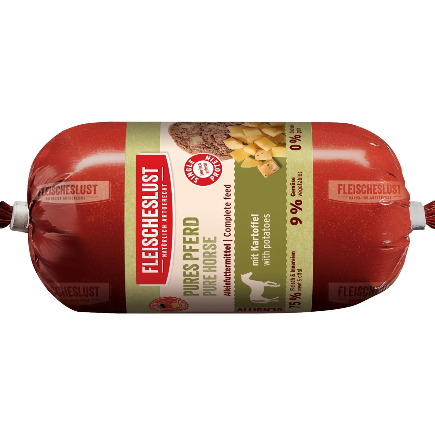 Heeft jouw hond een gevoelige maag of last van voedselallergieën? Fleischeslust Sensitive Paard & Aardappel is speciaal ontwikkeld voor honden die baat hebben bij een hypoallergeen dieet. Deze volledige voeding bevat 75% puur paardenvlees en orgaanvlees als enige dierlijke eiwitbron, gecombineerd met licht verteerbare aardappelen. Het lage vetgehalte en de zorgvuldige selectie van ingrediënten maken dit menu bijzonder geschikt voor honden met een gevoelige spijsvertering. Rijk aan omega-6-vetzuren door saffloerolie, zodat huid en vacht optimaal verzorgd worden. 100% natuurlijk, zonder granen, gluten of kunstmatige toevoegingen.