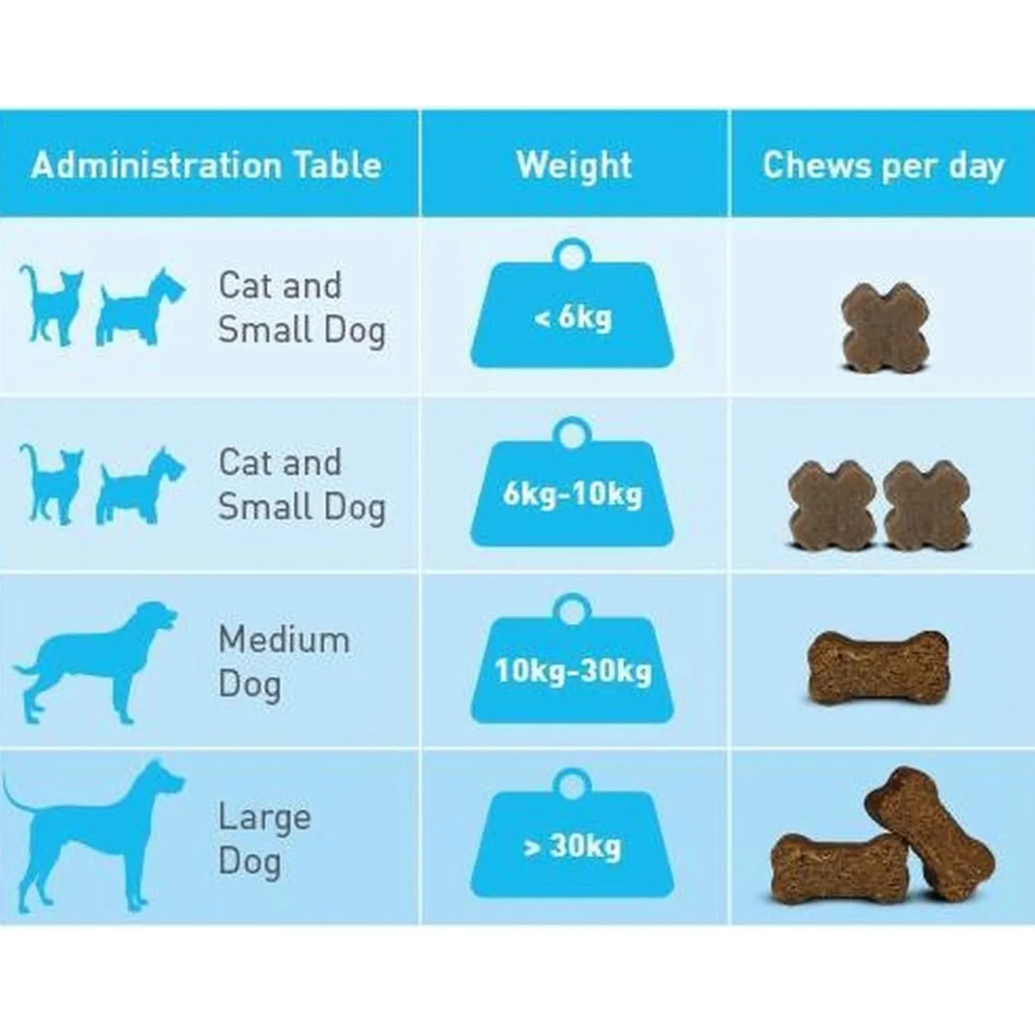 De smakelijke, zachte kauwbrokjes kunnen als traktatie worden gegeven of onder het voer worden vermengd. Afhankelijk van het gewicht van je hond zijn 1 tot 2 smakelijke kauwbrokjes per dag reeds voldoende.