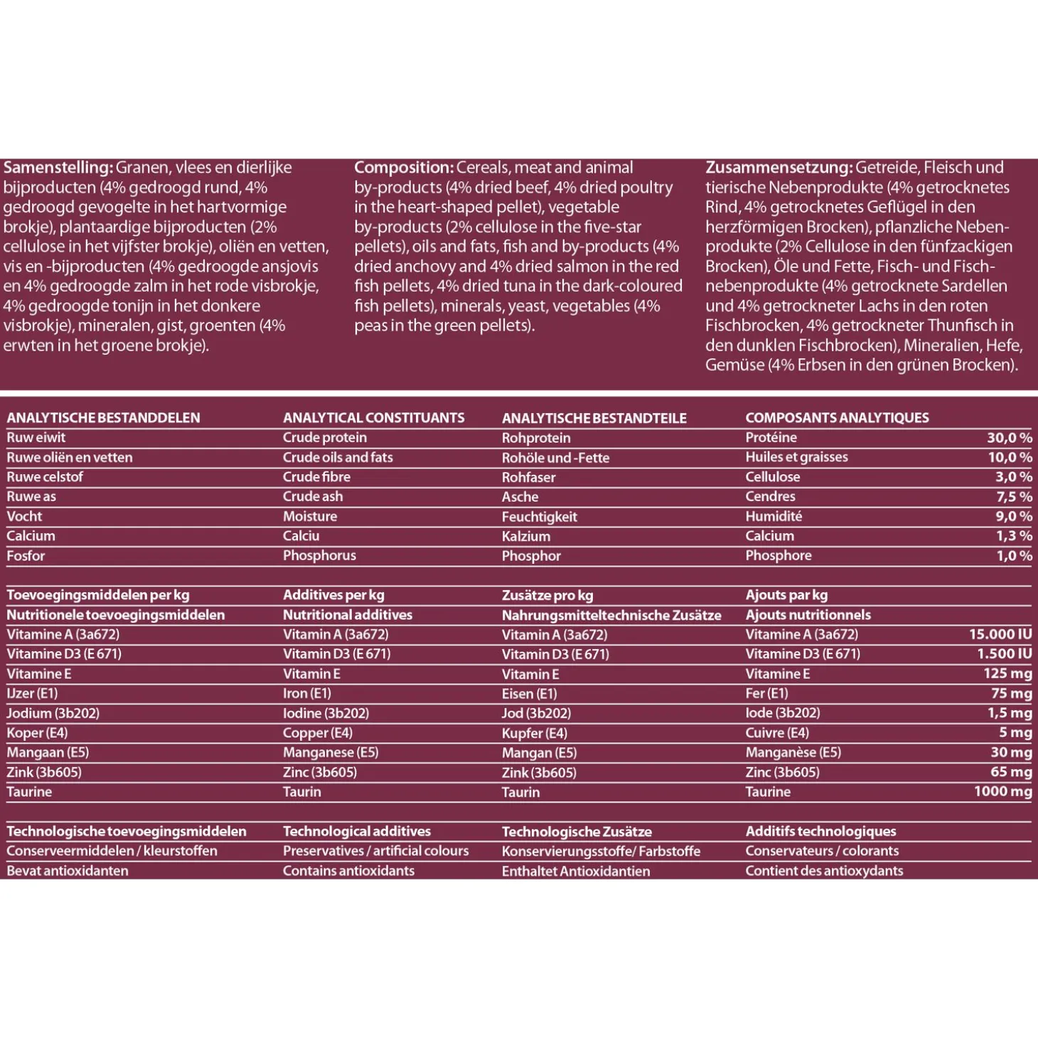 | Analyse | Granen, vlees en dierlijke bijproducten (4% rund, 4% gevogelte in de hartvormige brokjes), plantaardige bijproducten (2% cellulose in de 5 ster brokjes), Oliën en vetten, vis en visbijproducten (4% ansjovis en 4% zalm in de rode visbrokjes, 4% tonijn in de donkere visbrokjes), mineralen, gist en groenten (4% groenten in de groene brokjes). |