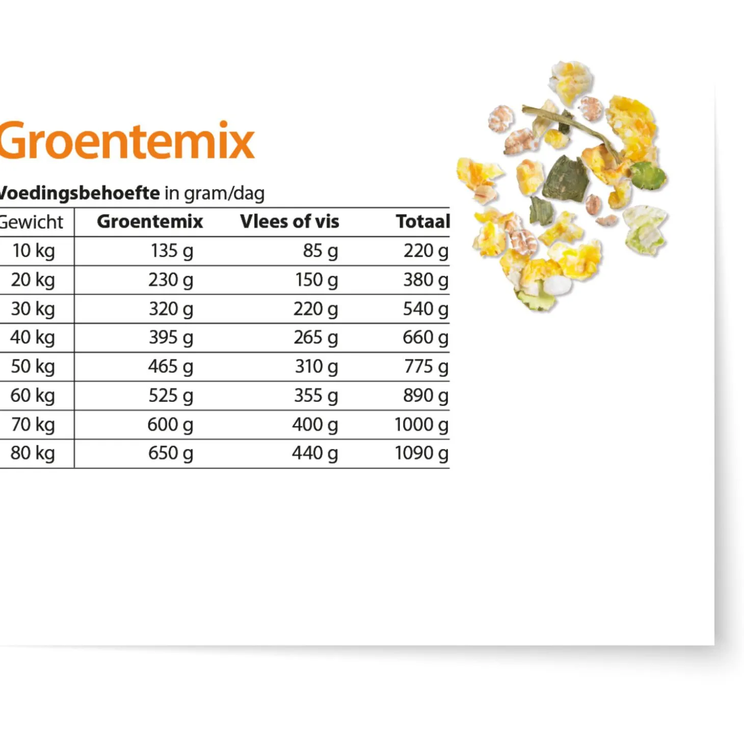Wanneer je (vers) vlees of vis voert, is het belangrijk dat je dit verrijkt met groenten om zo een evenwichtige maaltijd te creëren voor je hond. Met de Country Groentemix van Fokker maak je de maaltijd voor je viervoeter compleet.