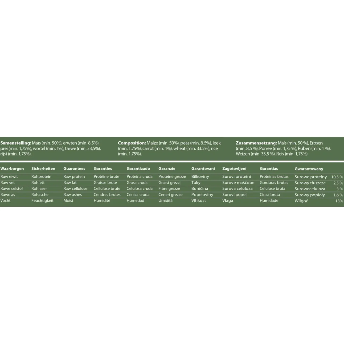 | Samenstelling | Maïs (min. 50%), erwten (min. 8,5%), prei (min. 1,75%), wortel (min. 1%), tarwe (min. 33,5%), rijst (min. 1,75%). Zonder kunstmatige geur-, kleur-, en smaakstoffen. Dit product bevat geen conserveringsmiddelen of antioxidanten. |