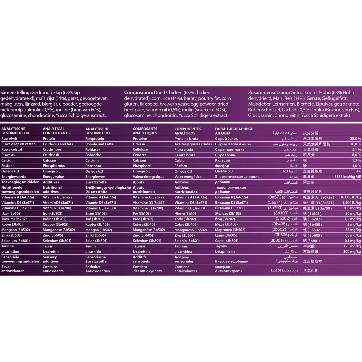 | Samenstelling | Gedroogde kip (63% kip gedehydrateerd), maïs, rijst (14%), gerst, gevogeltevet, maïsgluten, lijnzaad, biergist, eipoeder, gedroogde bietenpulp, zalmolie, inuline (bron van FOS), glucosamine, chondroïtine. |