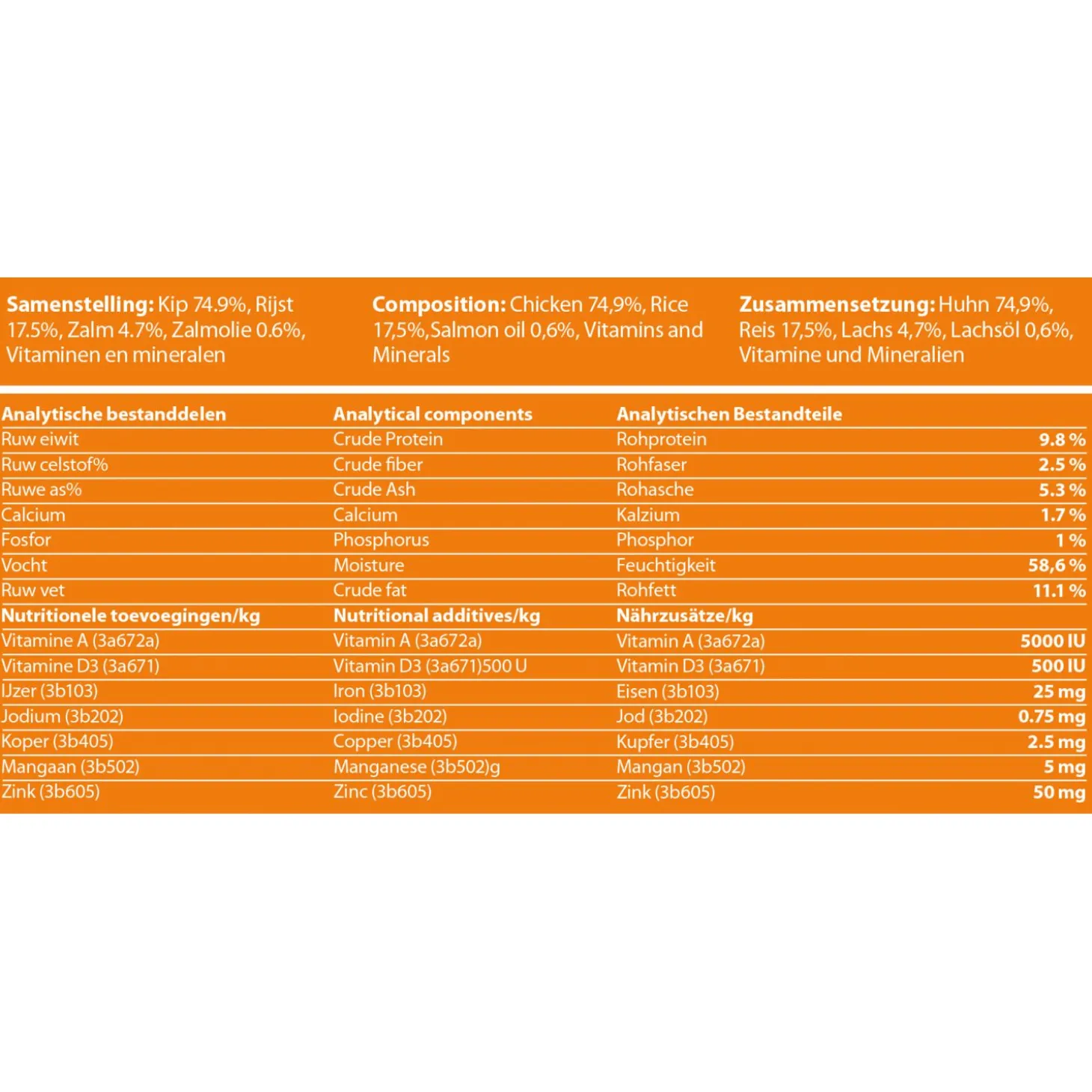 | Samenstelling | Kip 74,9%, Rijst 17,5%, Zalm 4,7%, Zalmolie 0,6%, Vitaminen en mineralen. |