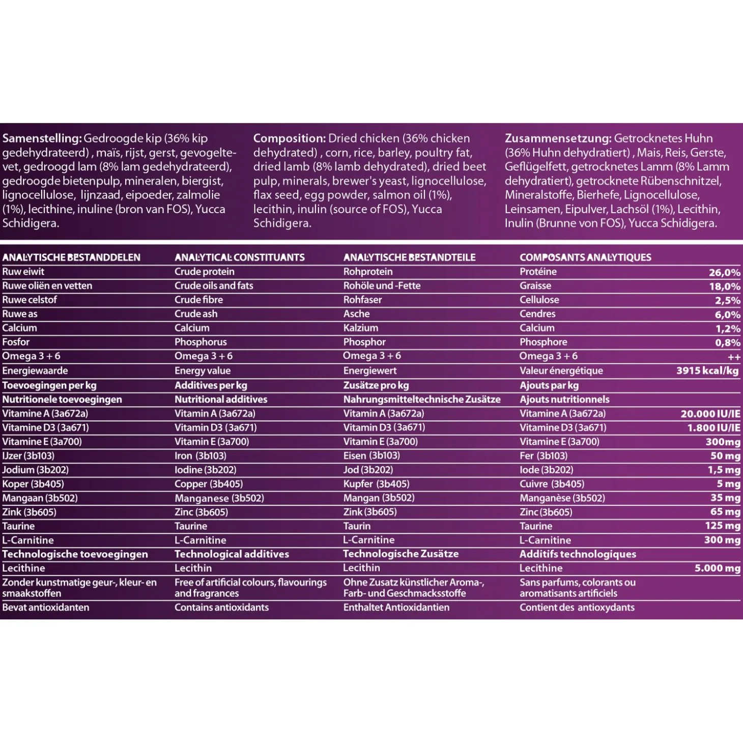 | Samenstelling | Gedroogde kip (36% kip gedehydrateerd), maïs, rijst (14%), gerst, gevogeltevet, gedroogde lam (8% lam gedehydrateerd), gedroogde bietenpulp, mineralen, biergist, lignocelluose, lijnzaad, eipoeder, zalmolie, lecithine, inuline (bron van FOS), Yucca Schidegera. |