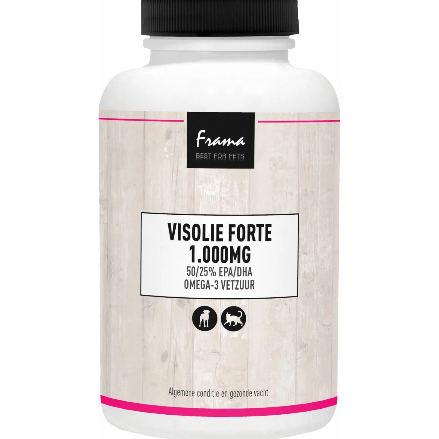 Frama Visolie Forte 1.000mg is een krachtig voedingssupplement dat speciaal is samengesteld ter ondersteuning van een betere algemene conditie van je huisdier. Deze visolie is niet alleen geschikt voor de algehele gezondheid, maar biedt ook specifieke voordelen voor de huid en vacht. Wat deze visolie echt onderscheidt, is de uitmuntende kwaliteit van de zuivere wilde visolie die wordt gebruikt. In tegenstelling tot sommige andere producten, wordt voor Frama Visolie Forte de gehele vis gebruikt, zonder enig restafval, waardoor je verzekerd bent van de hoogste kwaliteit en zuiverheid.Visolie staat bekend om zijn veelzijdige voordelen voor de gezondheid van je huisdier. Het dient niet alleen ter ondersteuning van hart- en bloedvaten, maar is ook effectief bij het verbeteren van een droge, ruwe en/of gevoelige huid, en het bevordert soepele gewrichten. Bovendien draagt visolie bij aan een betere vachtconditie, met een prachtige glans als resultaat. Vooral bij huid- en vachtproblemen, zoals erge verharing of een geïrriteerde huid, kan Frama Visolie Forte wonderen verrichten.