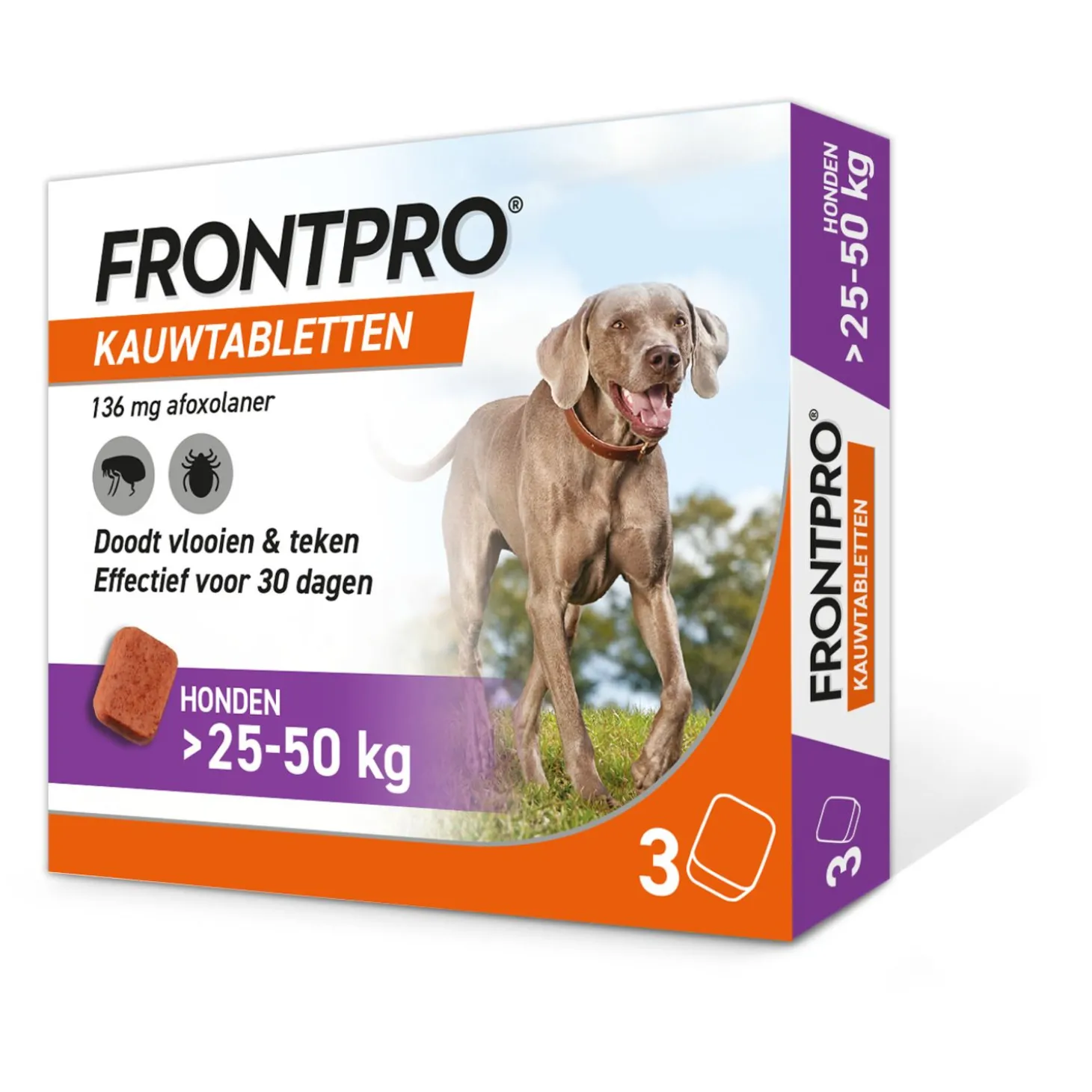 Nog voordat de vlooien eitjes kunnen leggen, worden ze gedood. Hierdoor wordt een besmetting van de leefruimte voorkomen. Zo doorbreek je de cyclus zal je hond gauw van deze vervelende gasten af zijn! Vlooien worden binnen 8 uur gedood en teken binnen 48 uur. FRONTPRO is verkrijgbaar in 4 varianten afhankelijk van het formaat van je hond. Het middel is geschikt voor honden vanaf 8 weken oud die tenminste 2 kg wegen.
