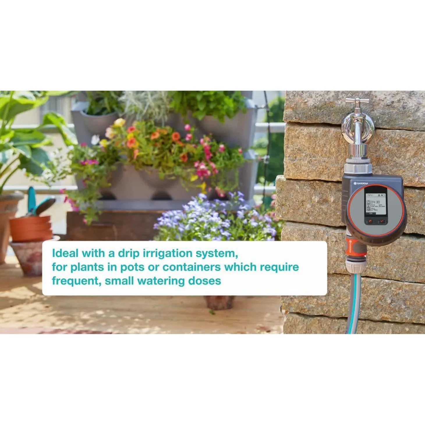 Het display van de computer is makkelijk leesbaar en toont je alle instellingen in 1 oogopslag. Het bedieningspaneel is tevens weerbestendig en kan worden verwijderd. Met de Besproeiingscomputer Flex kan je besproeiingstijden instellen in cycli van seconden, dit maakt de computer ook ideaal in combinatie met een druppelsysteem. Indien wenselijk kan je de Flex combineren met de Gardena Bodemvochtigheidssensor.