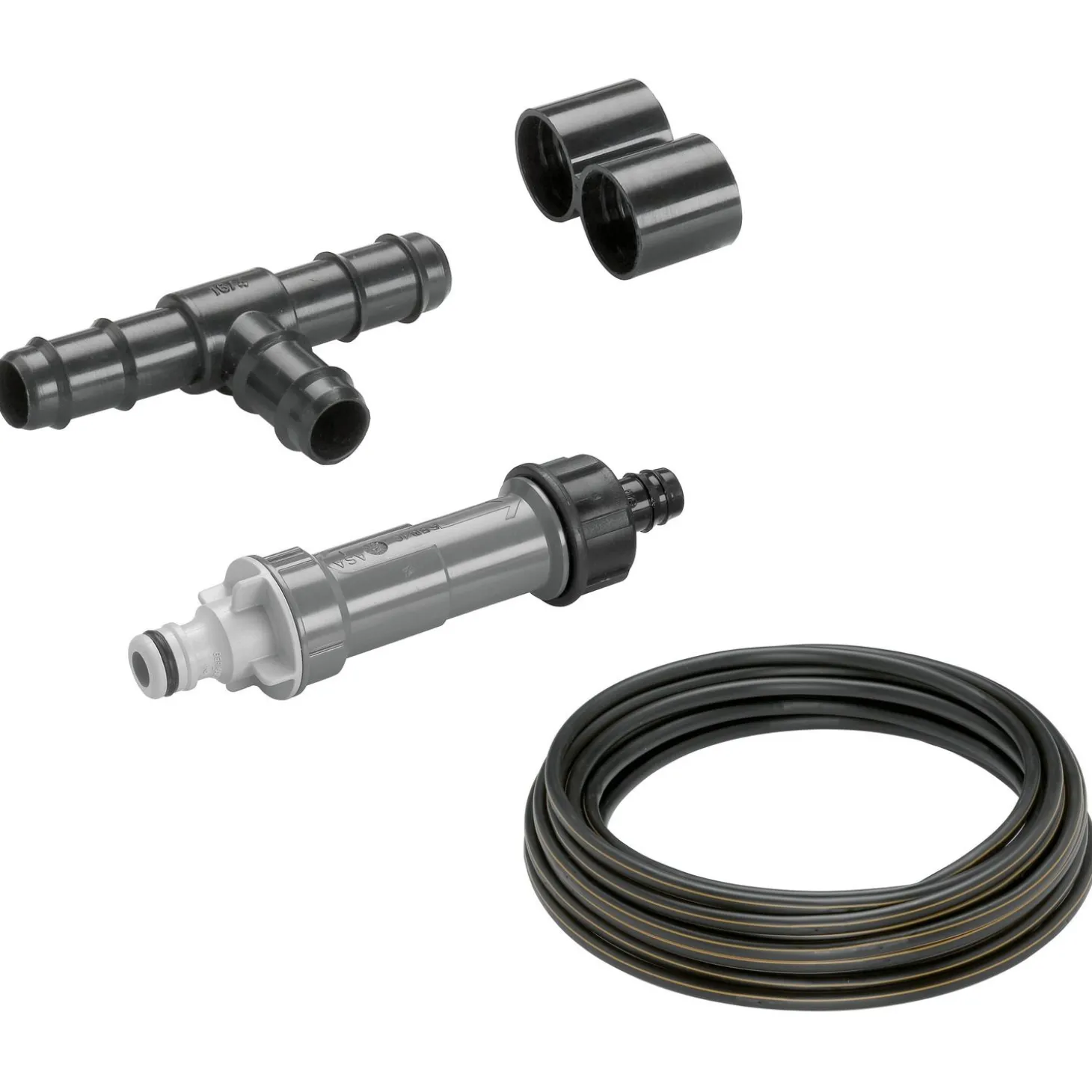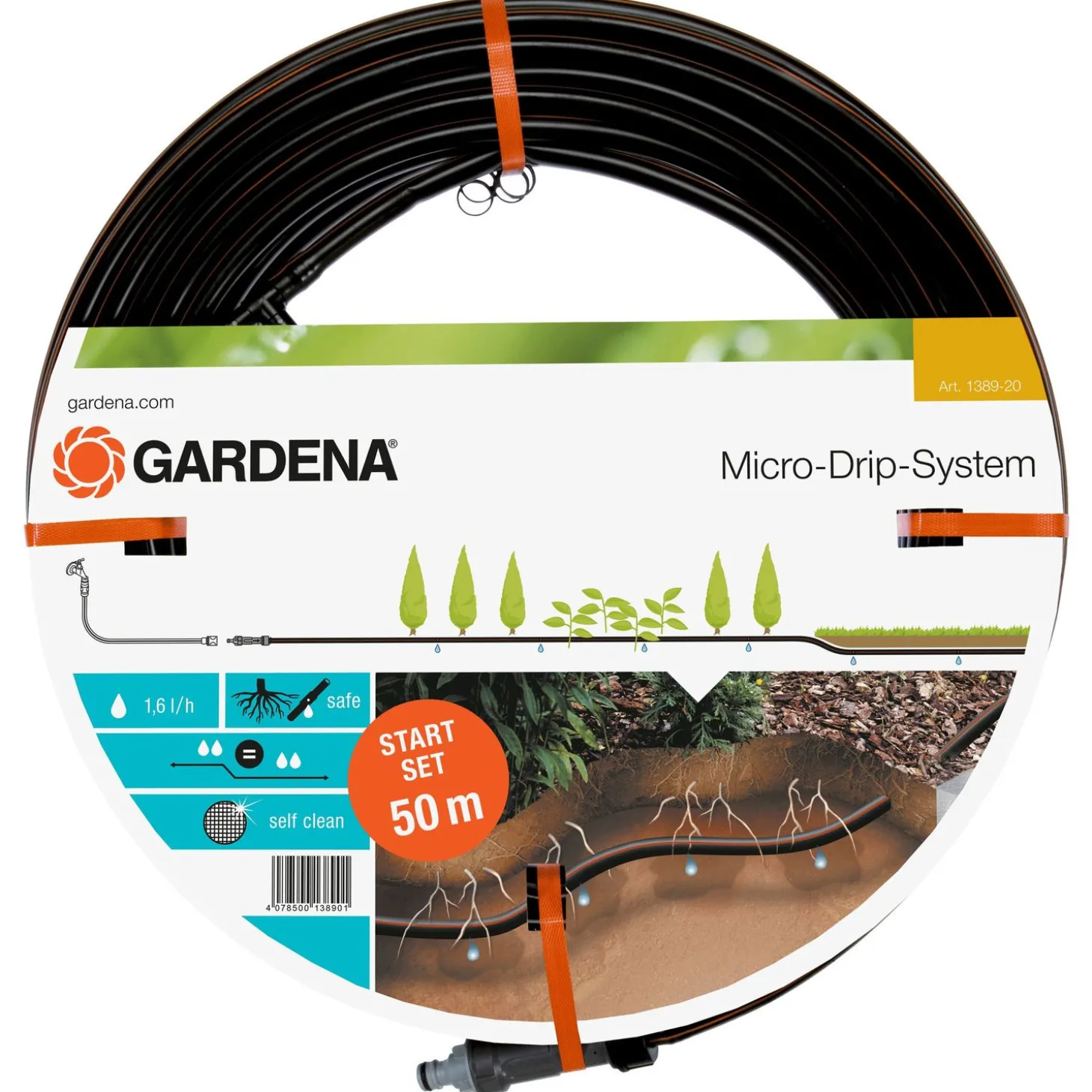 De set bevat het Hoofdapparaat 1000, een eindstuk en een T-stuk. De totale lengte is 50 meter. Met het Hoofdapparaat in het midden kan de druppelbuis worden verlengd met de verlengset (art. nr. 1395-20) tot een maximale lengte van 200 meter.