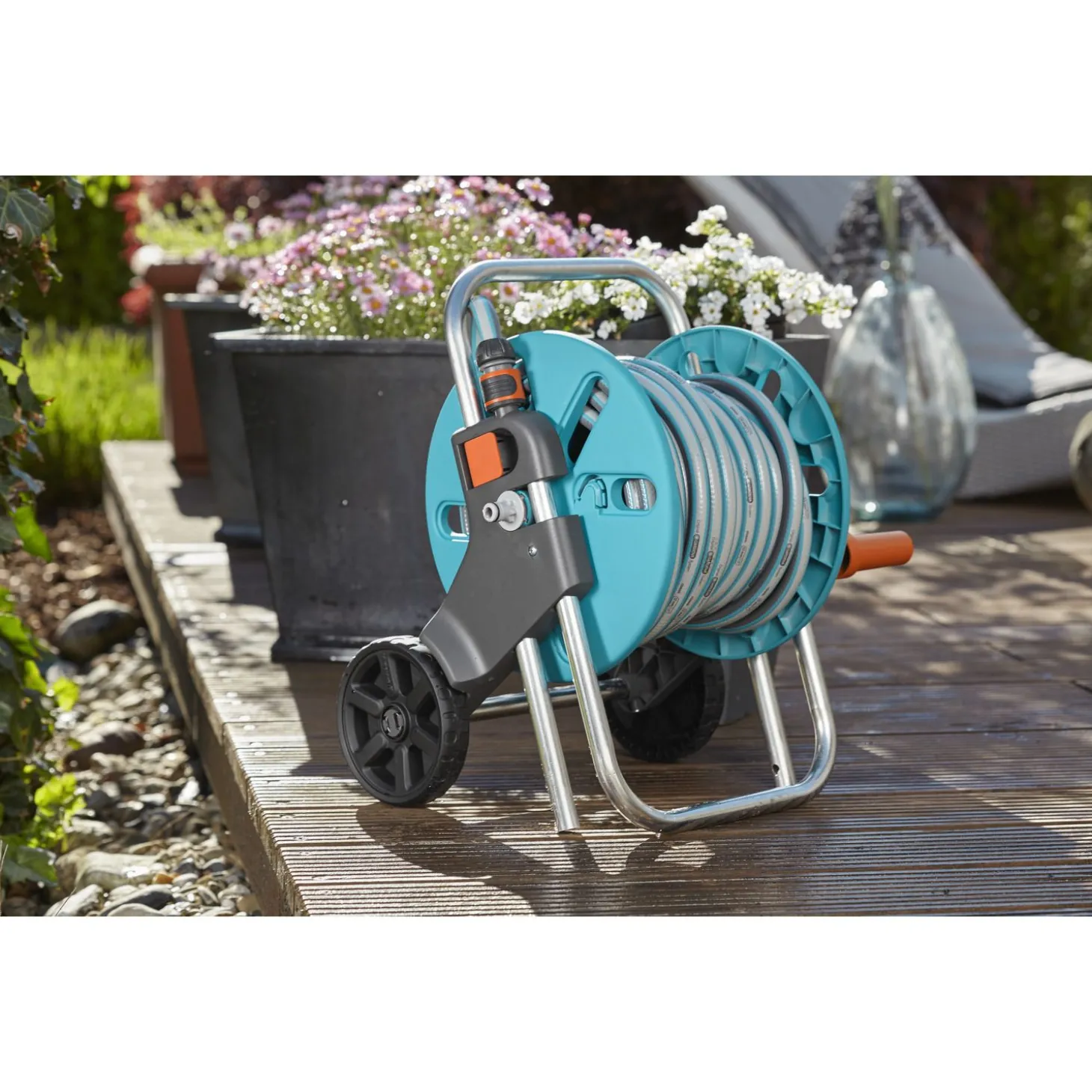 Onmisbaar voor in de tuin: de Slangenwagen CleverRoll S van Gardena. Een slangenwagen set met een eenvoudige bediening. Deze wagen zorgt voor een ruimtebesparende opslag van de slang en maakt oprollen een fluitje van een cent. De set bevat een slang, reinigingsmondstuk, waterstop en een hose connector.