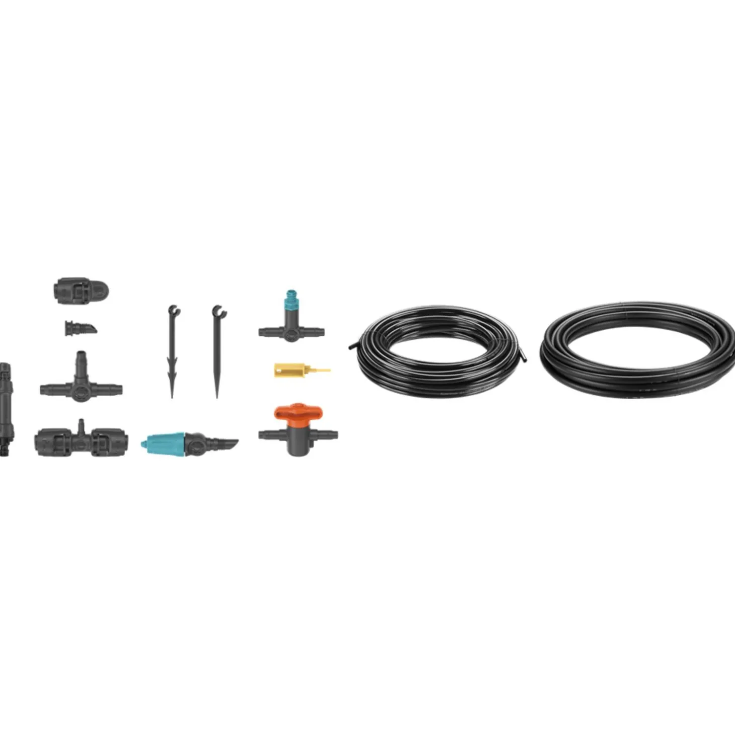 | Samenstelling | Set met aansluitstukken1 Master Unit 1000, 15 m Connecting Pipe Flex 13 mm (1/2″), 5 Pipe Pegs 13 mm (1/2″), 10 Connectors 13 mm (1/2″) – 4.6 mm (3/16″), 2 Plugs 13 mm (1/2″), 20 m Supply Pipe 4.6 mm (3/16″), 20 Pipe Pegs 4.6 mm (3/16″), 5 Plugs 4.6 mm (3/16″), 5 T-Joints 4.6 mm (3/16″), 3 Regulation and Shut-Off Valves 4.6 mm (3/16″), 10 Adjustable Endline Drip Heads 0-15 l/h, 20 Inline Drip Heads 2 l/h, 1 Cleaning Needle |