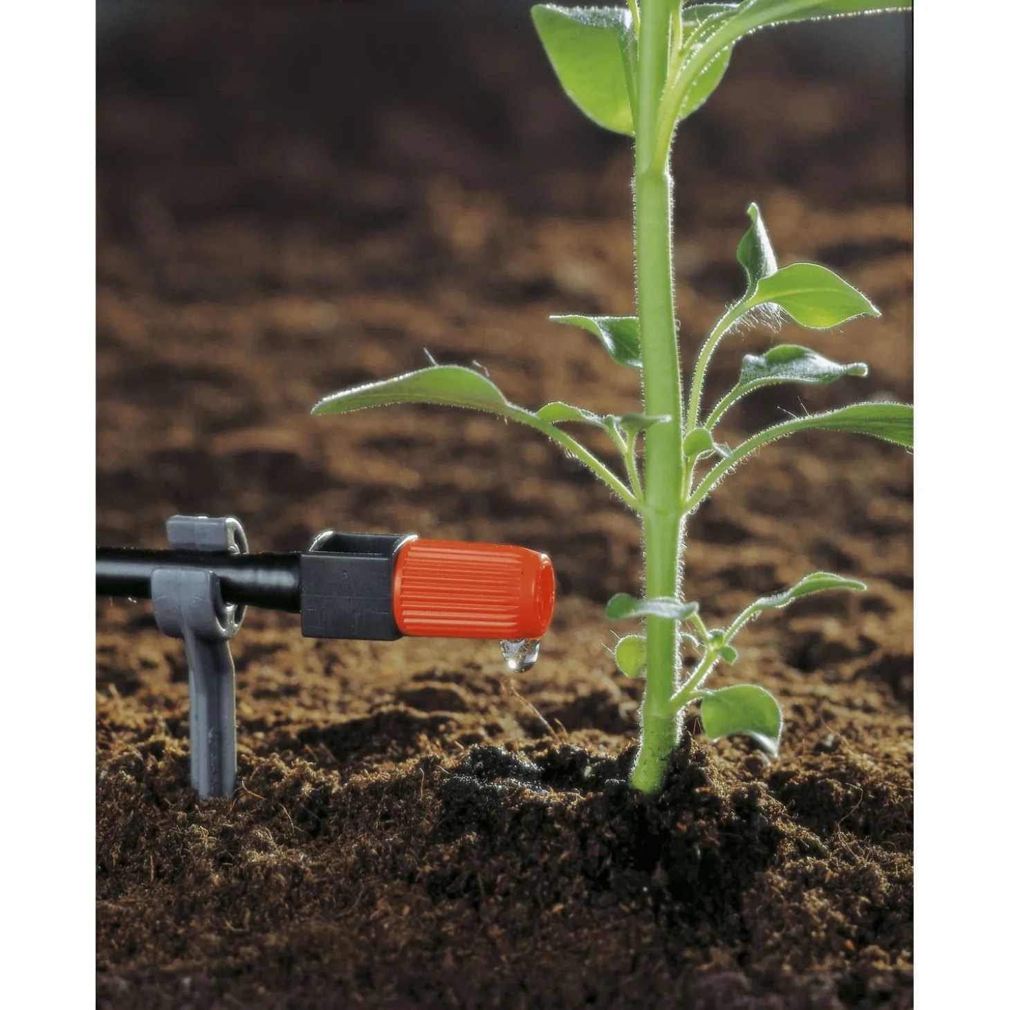 Voor het besproeien van afzonderlijke planten wordt de druppelaar in het uiteinde van de verdeelbuis (3/16”) gedraaid. Met het Installatiegereedschap (art. nr. 8322-20) kan de aanvoerbuis van 13 mm (1/2”) worden ingeboord en kan de einddruppelaar er direct op worden gemonteerd.