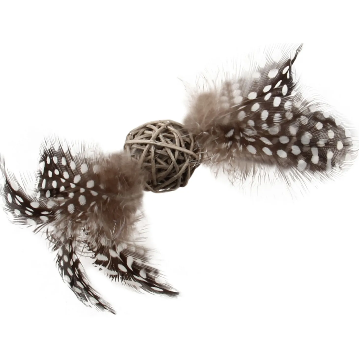 - natuurlijk kattenspeeltje in hout met ratelballetje en echte veren