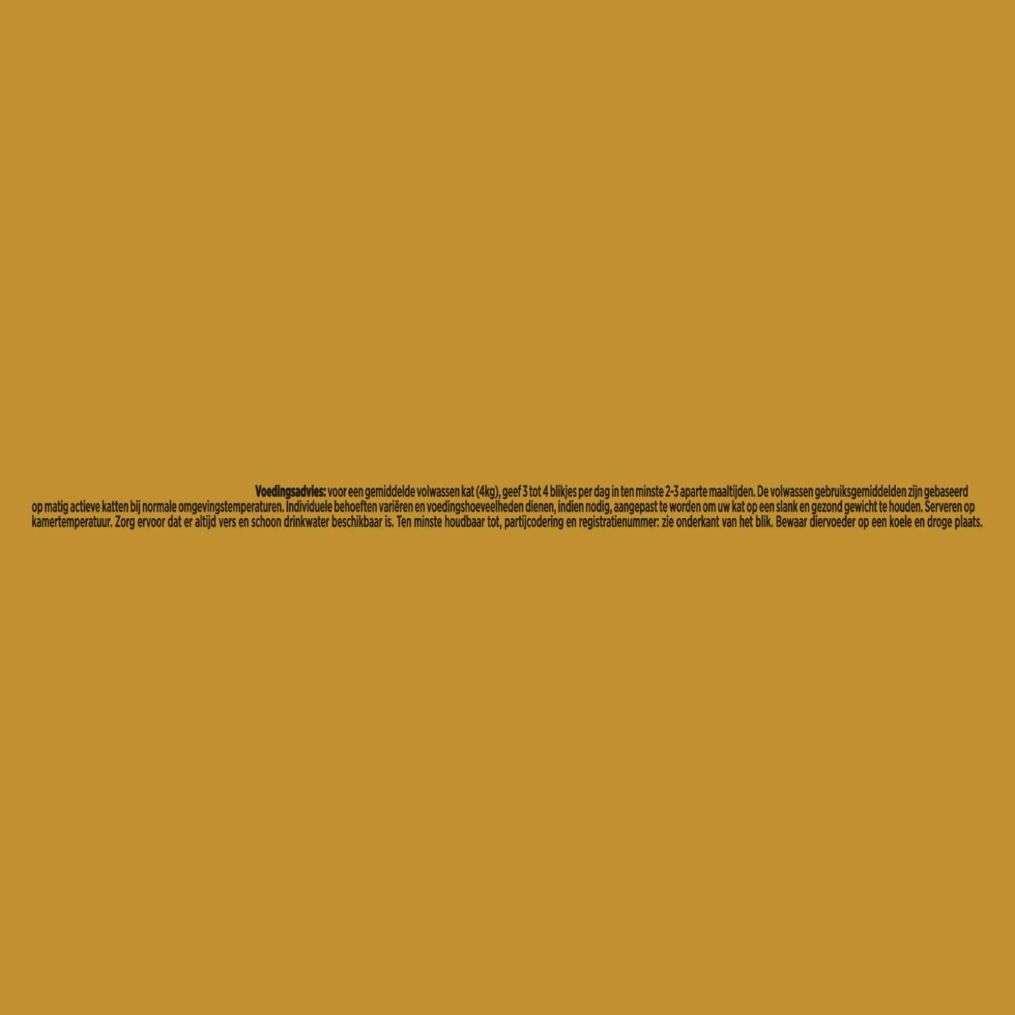| Aanbeveling | Voedingsadvies: voor een gemiddelde volwassen kat (4kg), geef 3 tot 4 blikjes per dag in ten minste 2-3aparte maaltijden. De volwassen gebruiksgemiddelden zijn gebaseerd op matig actieve katten bij normale omgevingstemperaturen. Individuele behoeften variëren en voedingshoeveelheden dienen, indien nodig, aangepast te worden om uw kat op een slank en gezond gewicht te houden. Serveren op kamertemperatuur. Zorg ervoor dater altijd vers en schoon drinkwater beschikbaar is. |