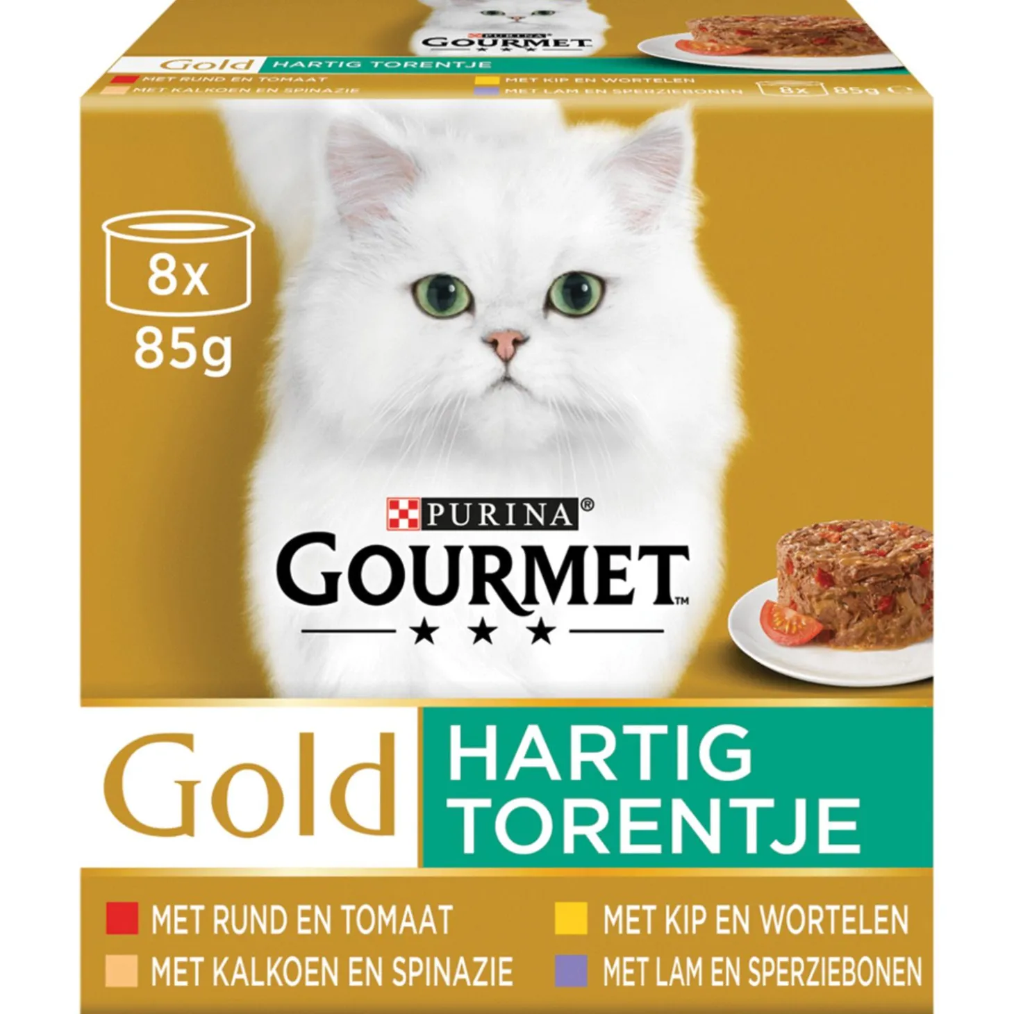 Katten hebben een verfijnde smaak en zijn zeer kieskeurig in wat ze lekker vinden. Maar bijna elke kat zal met zekerheid smullen van het Gourmet Gold Hartig Torentje. De natvoeding bestaat uit fijne stukjes vlees in een overheerlijke saus. Deze verpakking bevat 8 blikjes in de smaken rund-tomaat, kip-wortel, kalkoen-spinazie en lam-sperzieboon zodat je je kat elke dag weer kunt verwennen met een unieke smaakbeleving.