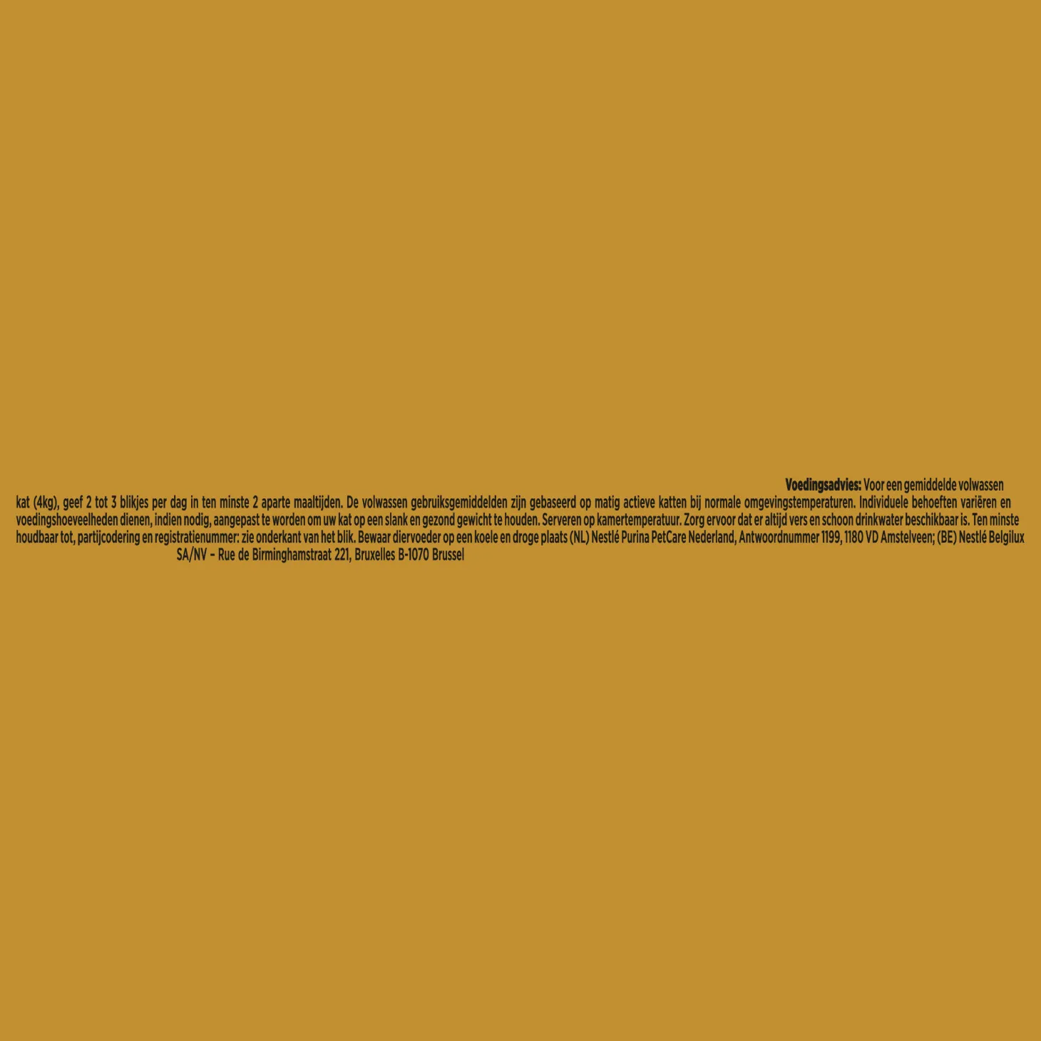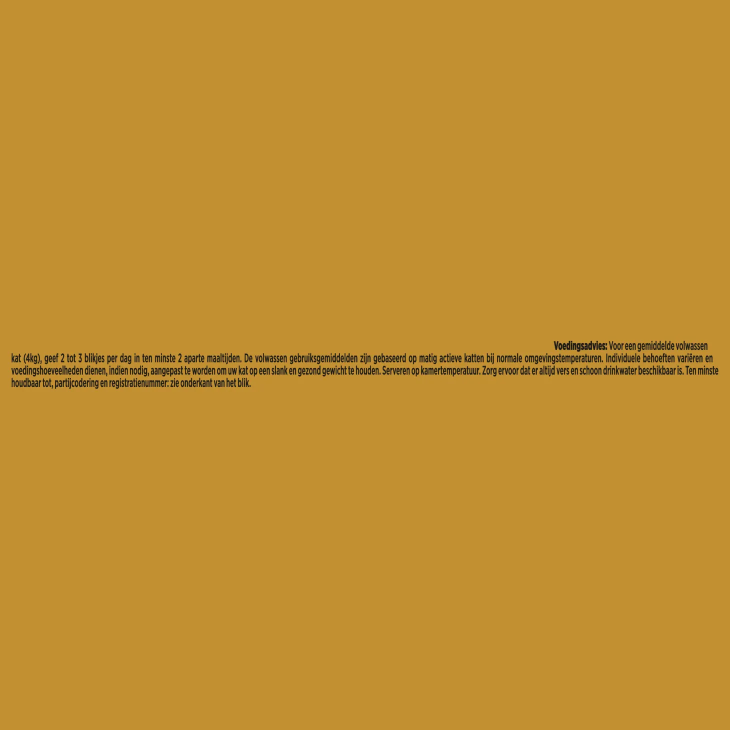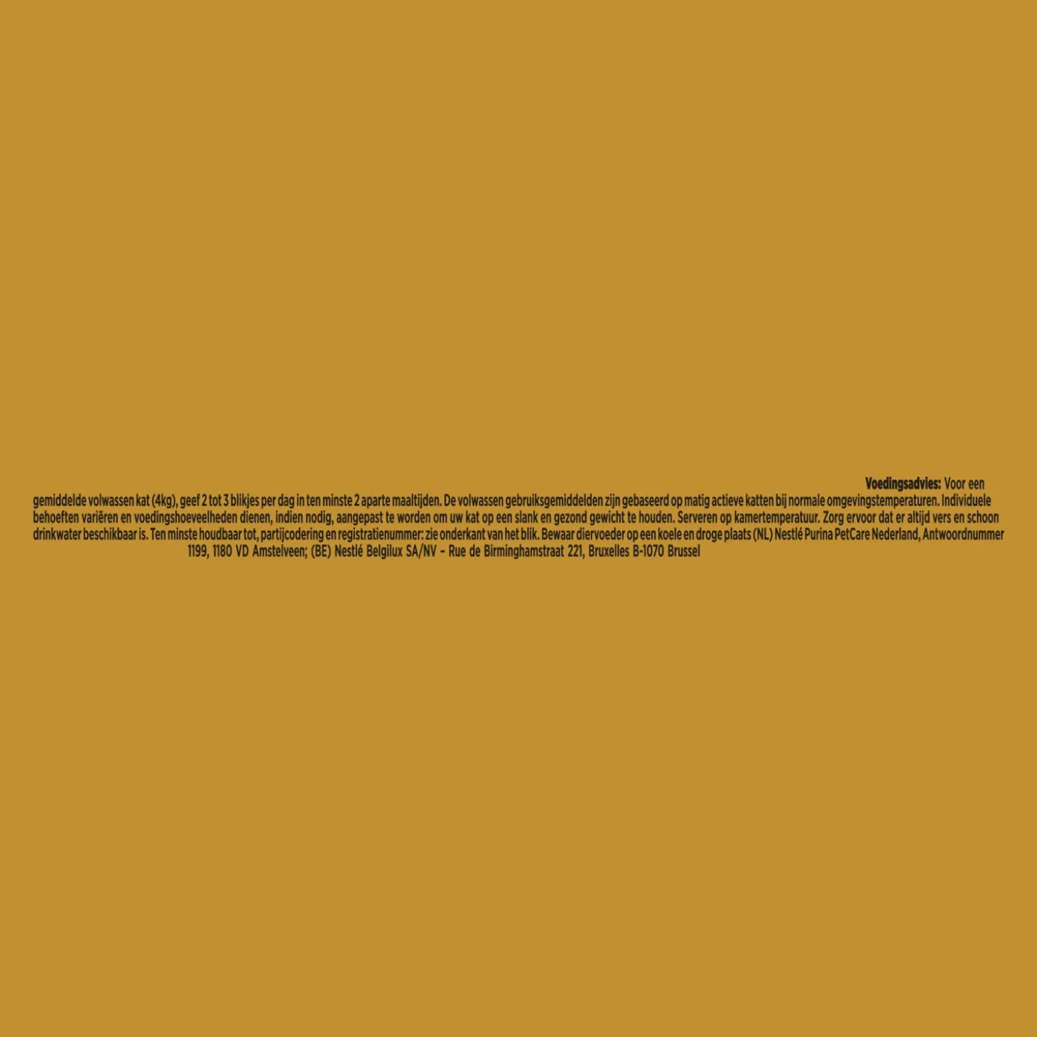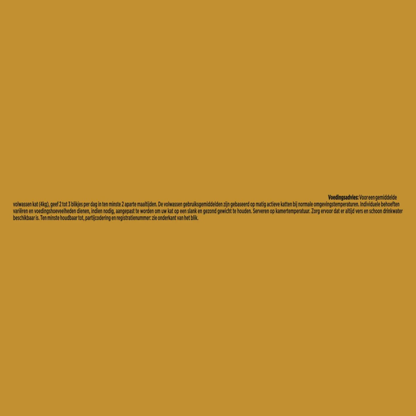 | Aanbeveling | Voedingsadvies: Voor een gemiddelde volwassen kat (4kg), geef 2 tot3 blikjes per dag in ten minste 2 aparte maaltijden. De volwassen gebruiksgemiddelden zijn gebaseerd op matig actieve katten bij normale omgevingstemperaturen. Individuele behoeften variëren en voedingshoeveelheden dienen, indien nodig, aangepast te worden om uw kat op een slank en gezond gewicht te houden. Serveren op kamertemperatuur. Zorg ervoor dater altijd vers en schoon drinkwater beschikbaar is. |