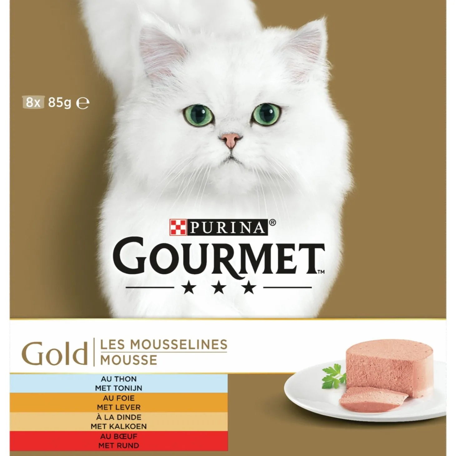 De Gourmet Gold Mousse bevat 8 blikjes van elks 85 gram.