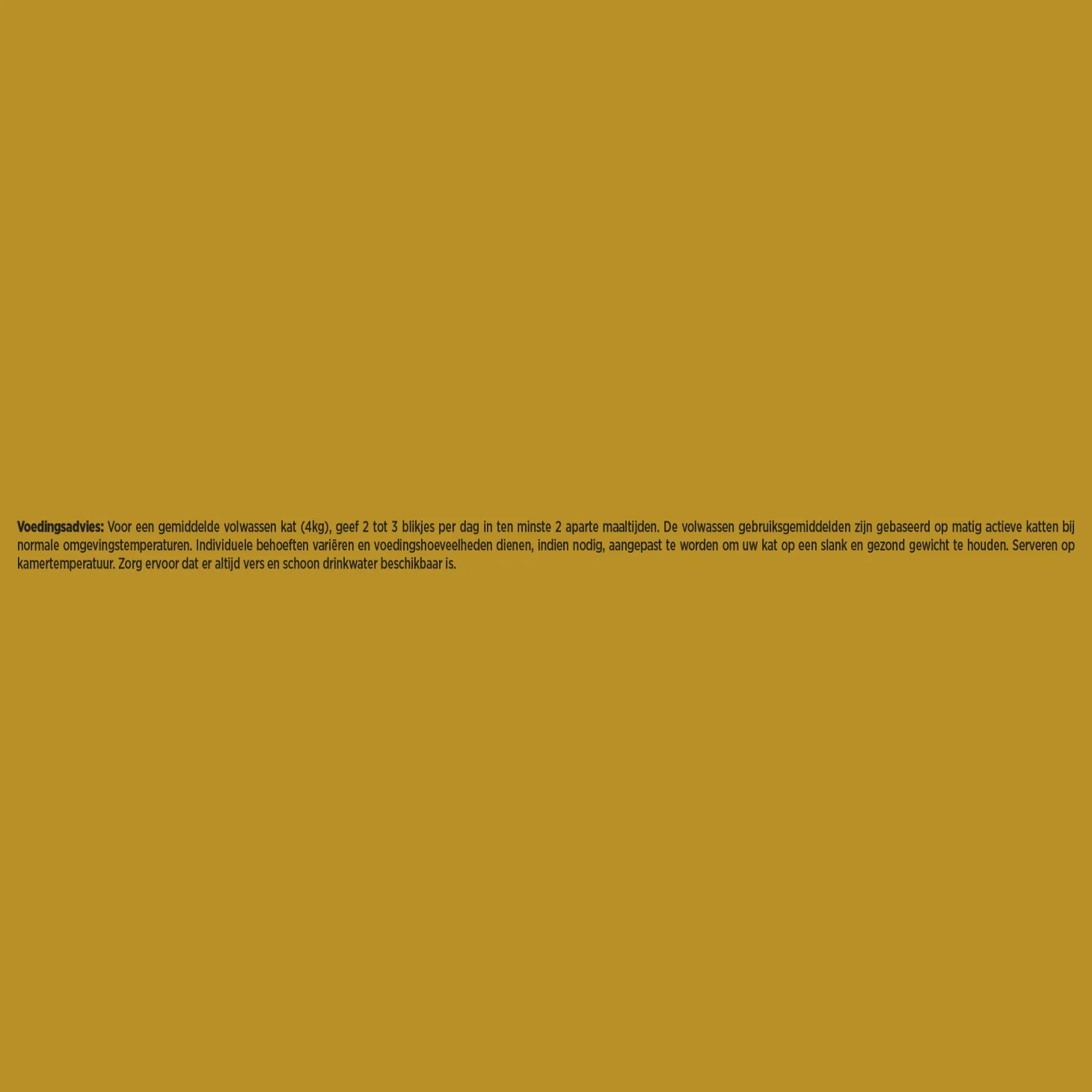 | Aanbeveling | Voedingsadvies: Voor een gemiddelde volwassen kat (4kg), geef 2 tot3 blikjes per dag in ten minste 2 aparte maaltijden. De volwassen gebruiksgemiddelden zijn gebaseerd op matig actieve katten bij normale omgevingstemperaturen. Individuele behoeften variëren en voedingshoeveelheden dienen, indien nodig, aangepast te worden om jouw kat op een slank en gezond gewicht te houden. Serveren op kamertemperatuur. Zorg ervoor dater altijd vers en schoon drinkwater beschikbaar is. |