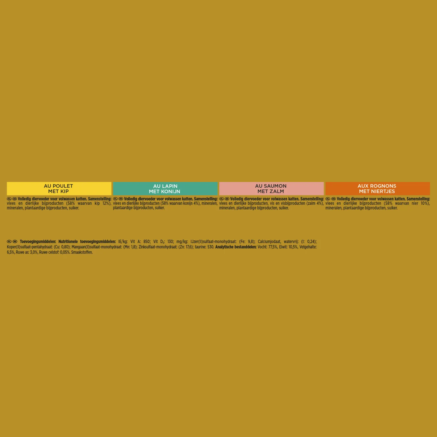 | Samenstelling | Samenstelling: met Konijn: Vlees en dierlijke bijproducten (58% waarvan konijn 4%), mineralen, plantaardige bijproducten, suiker. met Kip: Vlees en dierlijke bijproducten, (58%waarvan kip 12%), mineralen, plantaardige bijproducten, suiker. met Zalm: Vlees en dierlijke bijproducten, vis en visbijproducten (zalm 4%), mineralen, plantaardige bijproducten, suiker. met Niertjes: Vlees en dierlijke bijproducten (58% waarvan nier 10%), mineralen, plantaardige bijproducten, suiker. |